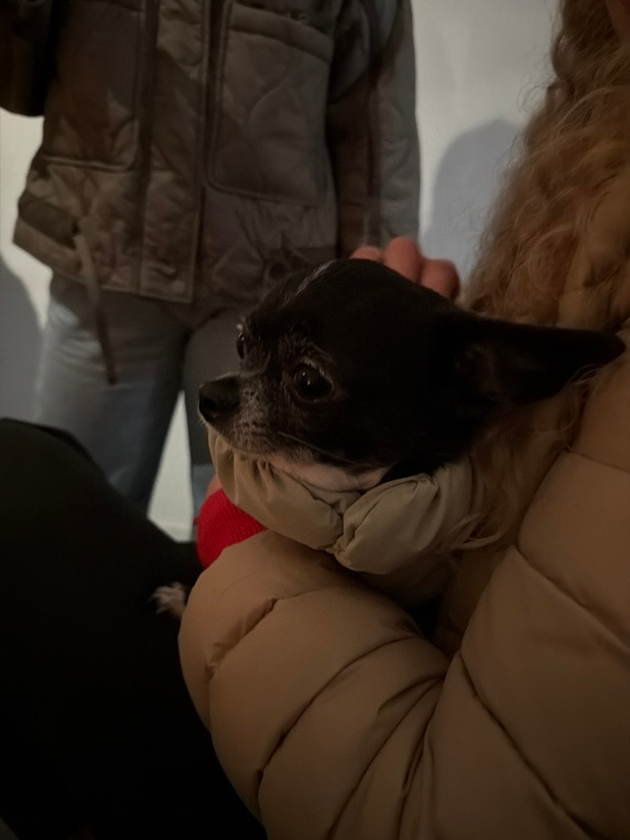 The image displays an indoor scene in Tel-Aviv, Israel, focusing on a small dark-furred Chihuahua dog being held. The dog, predominantly black with a graying muzzle and dark eyes, is looking to the leβ¦read more