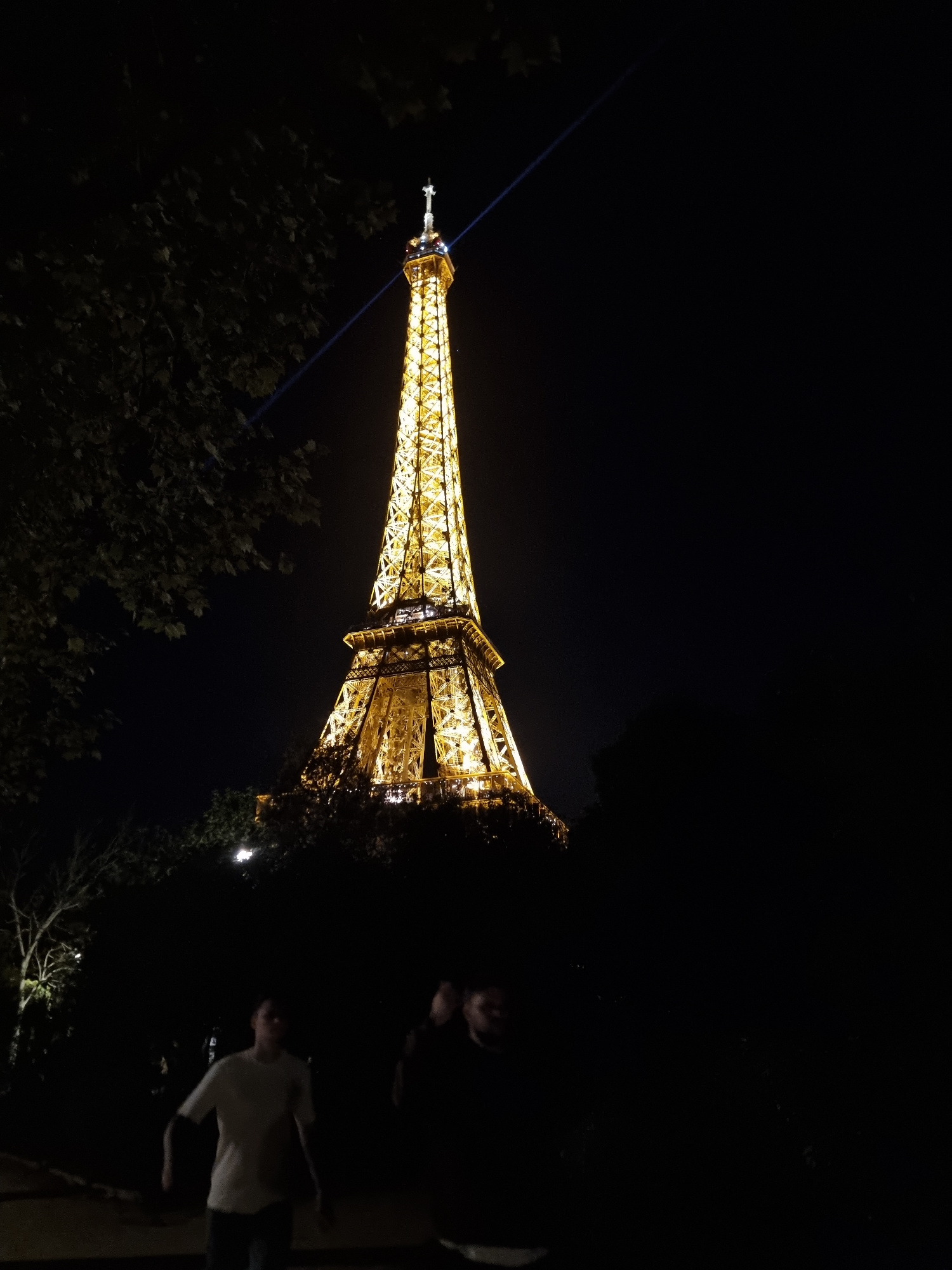 The image depicts the Eiffel Tower at night, illuminated with golden lights. A blue beam shines from the top of the tower. There are trees visible in the foreground, partially obscuring the lower part…read more