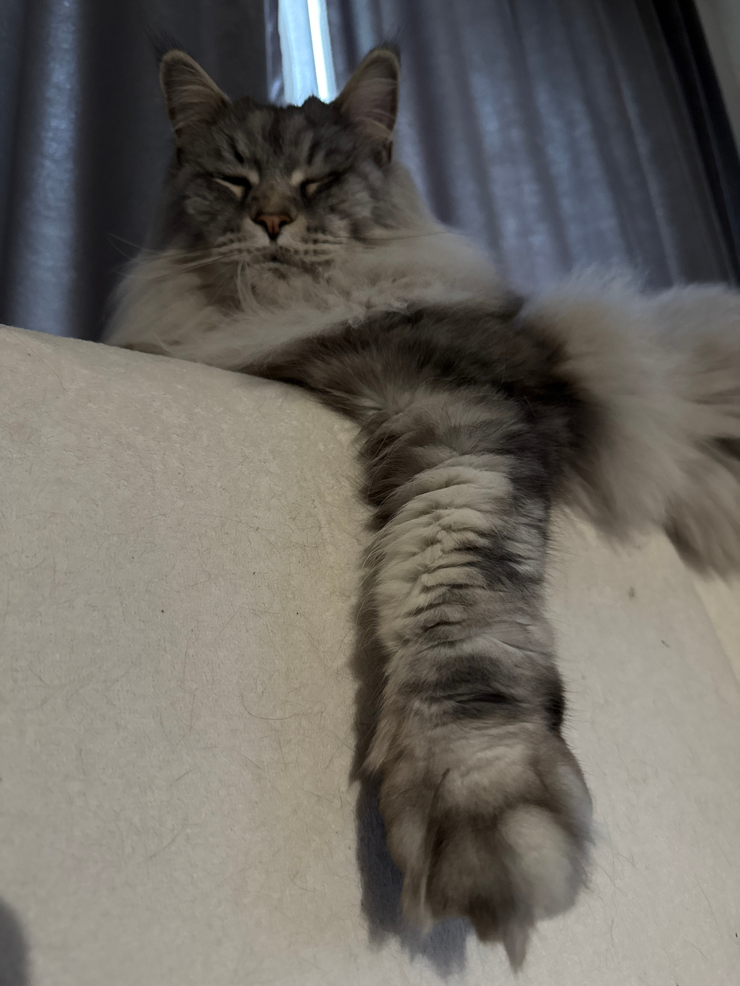 A gray and white long-haired cat is resting on a beige surface. The cat is lying on its side with its head near the edge of the surface, and one paw is extended out. The cat's eyes are closed, and it…read more