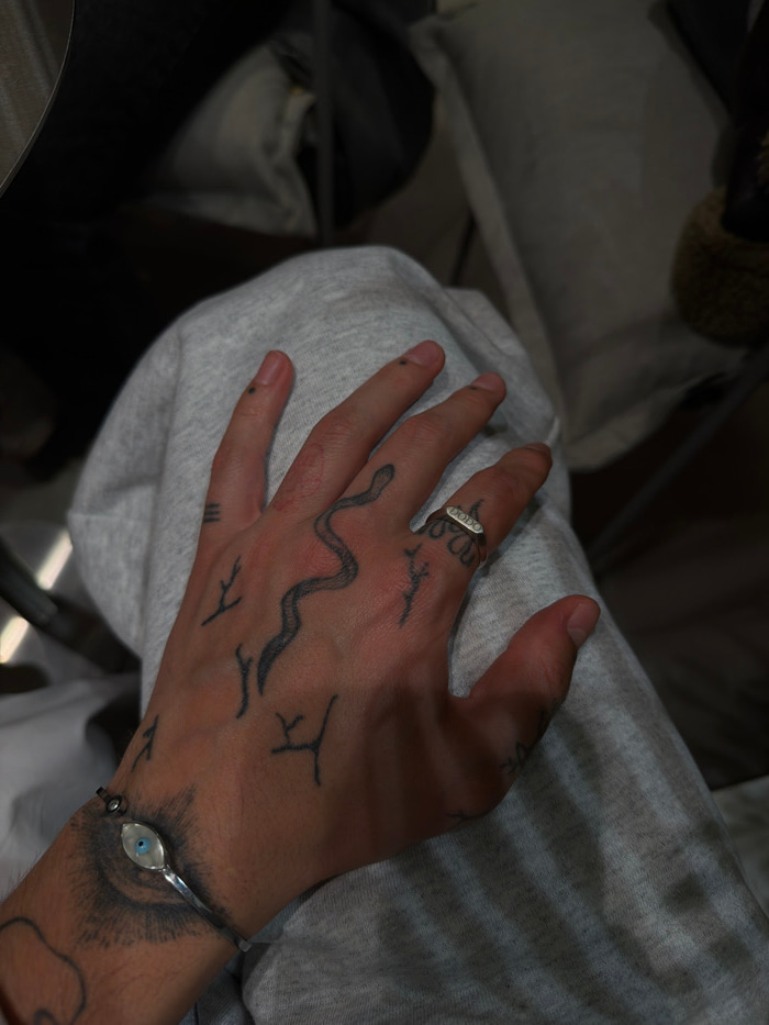 A person's hand rests on a light grey fabric. The hand has several tattoos, including a snake on the back, geometric designs, and an eye-shaped tattoo on the wrist holding a silver bracelet with an ey…read more