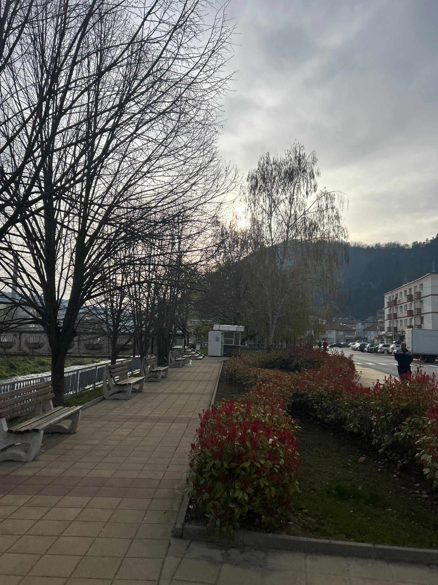 This image, correctly oriented, displays an outdoor scene in Zlatograd, Bulgaria, likely during late autumn or winter. The view is along a paved promenade or riverside walk, bordered by bare deciduous…read more