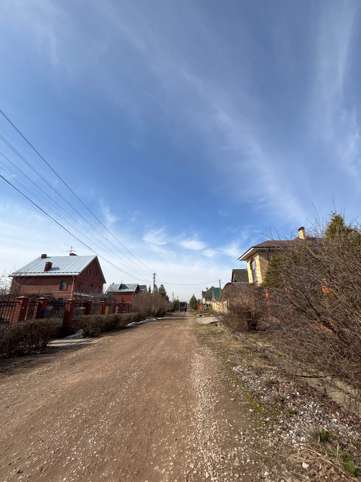 The image depicts a street in the settlement of Ferme, Russia. The view is along a dirt road lined with houses on both sides. The houses on the right are mostly two-story brick buildings with metal ro…read more
