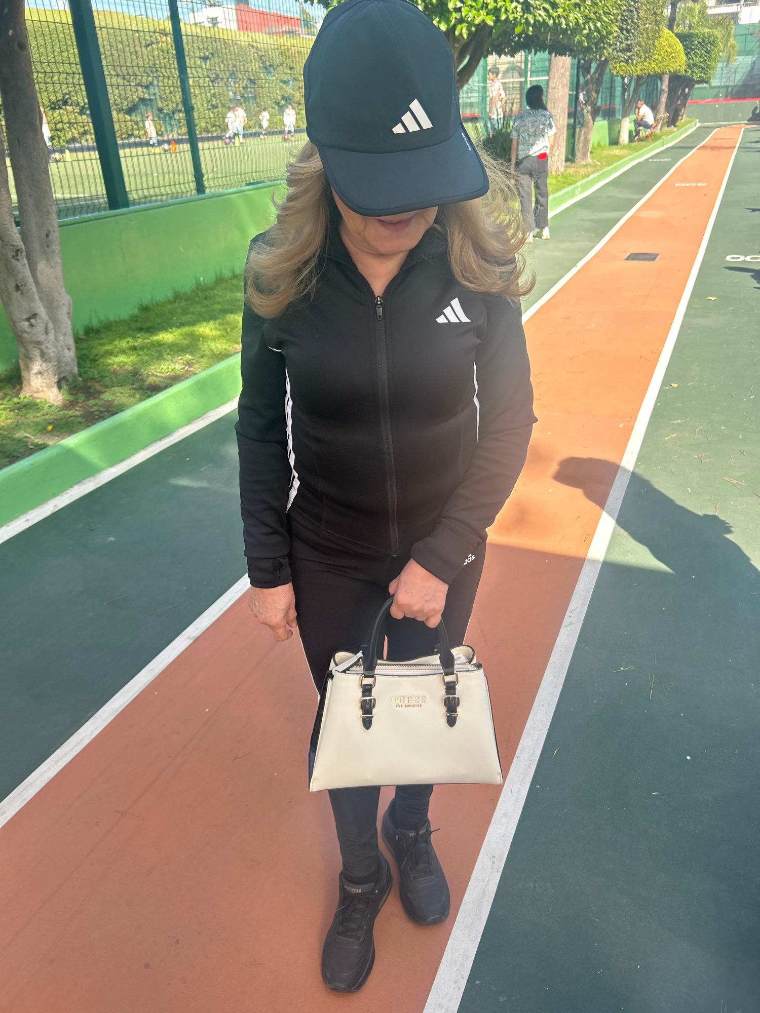 A woman wearing a black Adidas track suit, black sneakers, and a dark blue Adidas baseball cap is standing on a tennis court. She is holding a cream-colored Guess handbag. The tennis court is in Puebl…read more