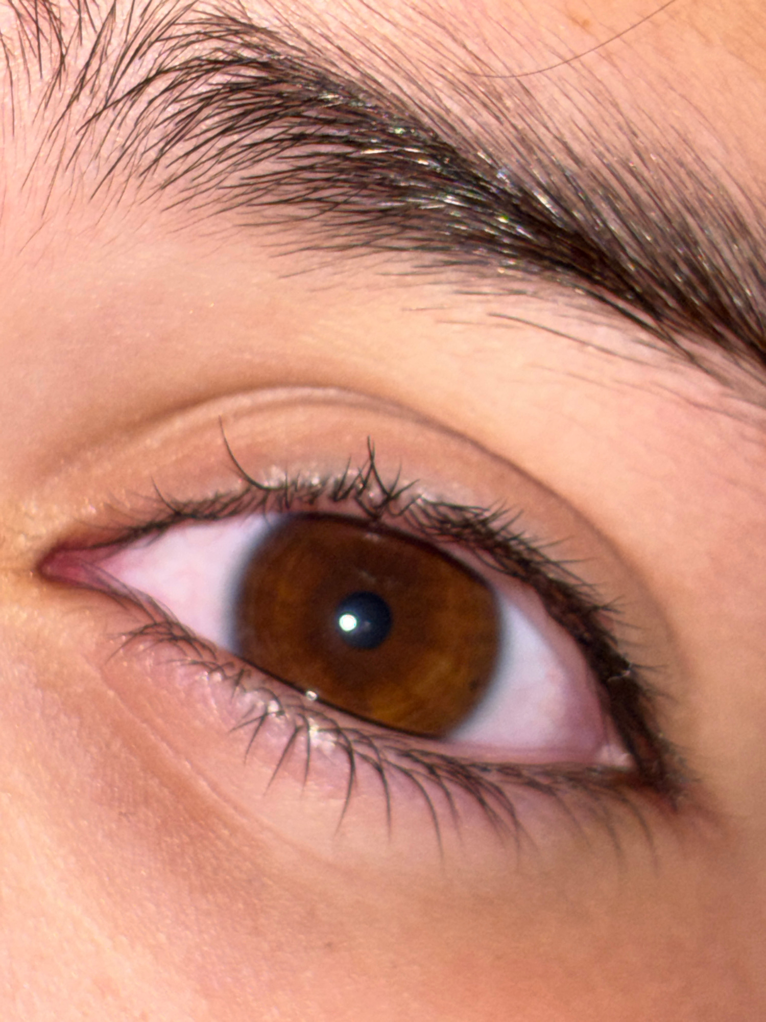 The image is a close-up view of a human eye, likely female, with dark brown iris and dark eyelashes. The eyebrow is also visible, with individual hairs clearly defined. The skin surrounding the eye ap…read more