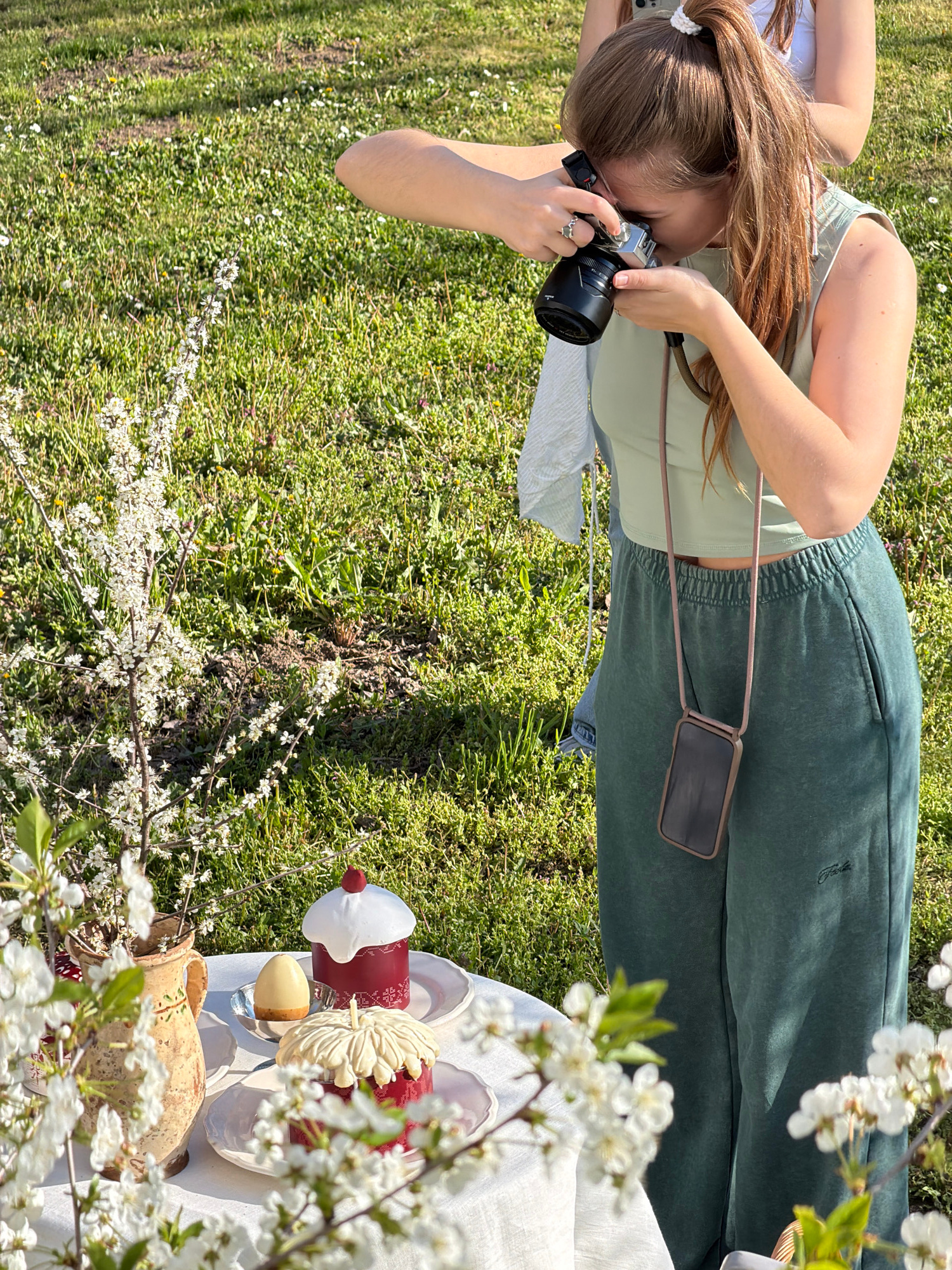 In Irig Municipality, Serbia, a woman is taking a photograph outdoors. She is wearing a light green crop top, dark green sweatpants with a Polo logo, and is holding a black camera. A phone in a case h…read more