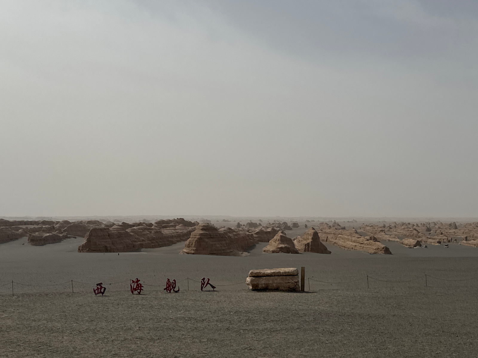 This image depicts a vast, desolate desert landscape in Dunhuang City, China, characterized by numerous striking geological formations known as yardangs. These wind-eroded rock structures, varying in…read more