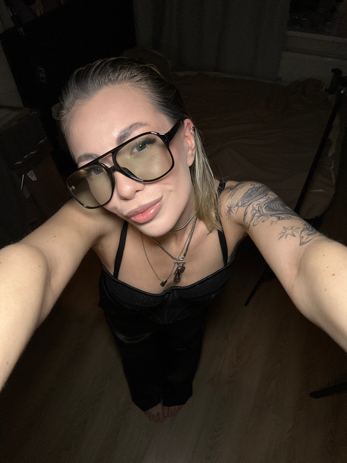 A light-skinned young adult female is depicted indoors in the city of Khimki, Russia. She is taking a high-angle, full-body selfie, looking directly at the camera with a subtle smile and glossy, sligh…read more