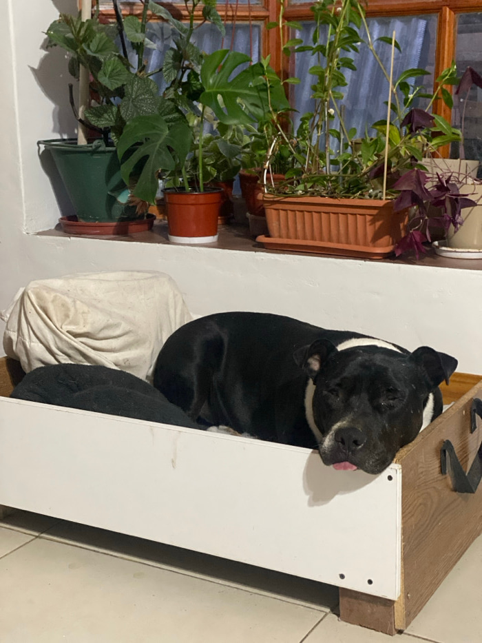 A black and white dog rests its head on a white cabinet with a wooden top. The dog's tongue is slightly visible. The dog is sitting on a white cushion with dark clothing visible below it. To the left,…read more