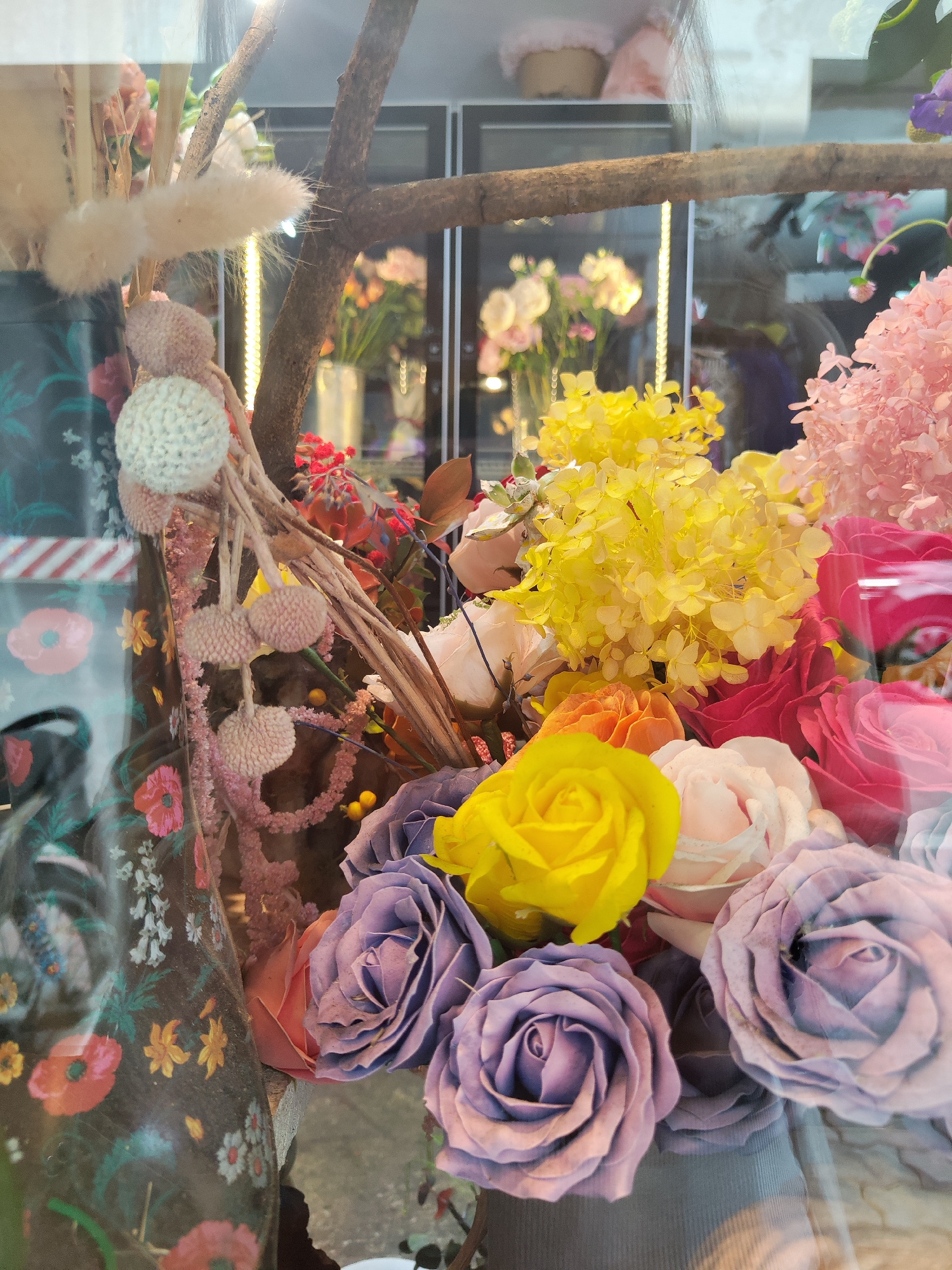 The image shows a floral arrangement in a display case, likely inside a shop. The foreground is dominated by colorful roses in various shades including lavender, yellow, red, orange, and white, inters…read more