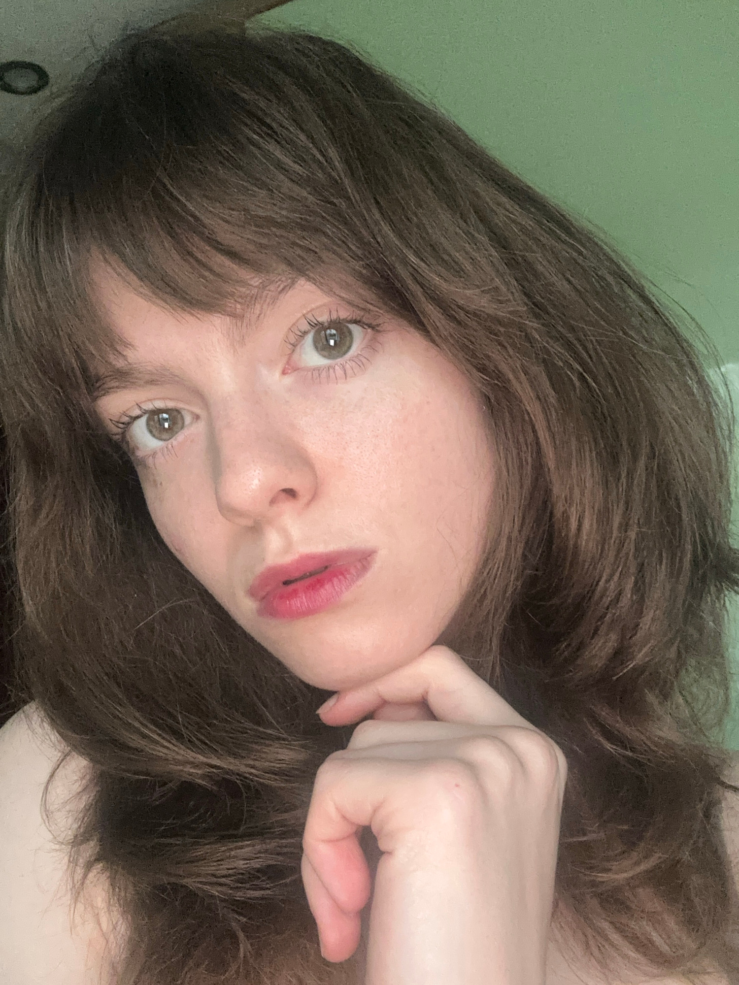 A rotated close-up portrait features a young adult female, likely taken indoors in Moscow, Russia. Her head and part of her upper body are visible, framed by her long, wavy dark brown hair that spread…read more