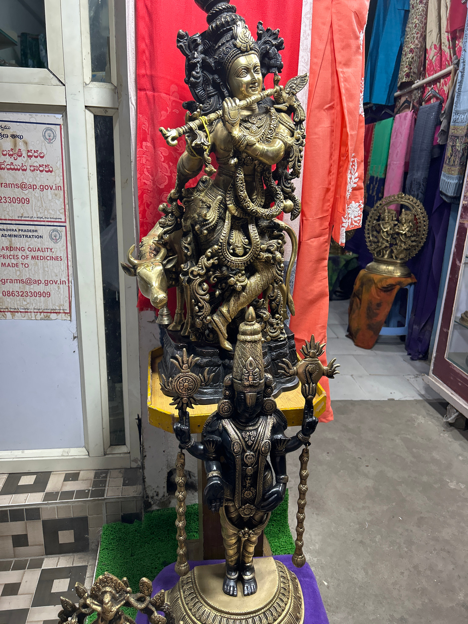 A highly detailed, ornate metal statue of a Hindu deity dominates the foreground. It is situated on a platform covered with purple fabric on one end and green artificial grass on the other, with a sma…read more