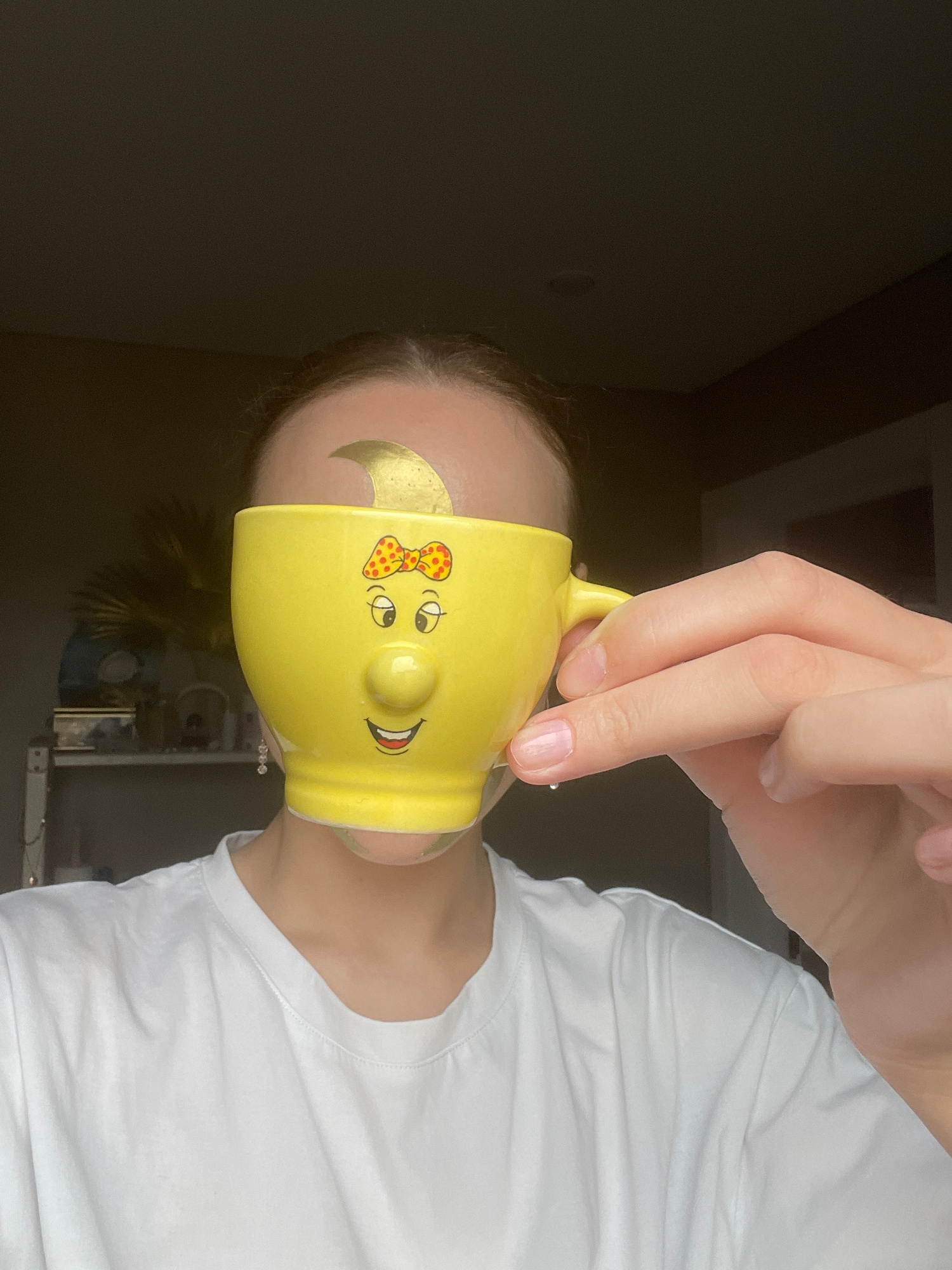 An indoor, portrait-oriented image shows a person holding a yellow ceramic mug up to their face, largely obscuring it. The person is wearing a white t-shirt, and their hand, with light pink fingernail…read more