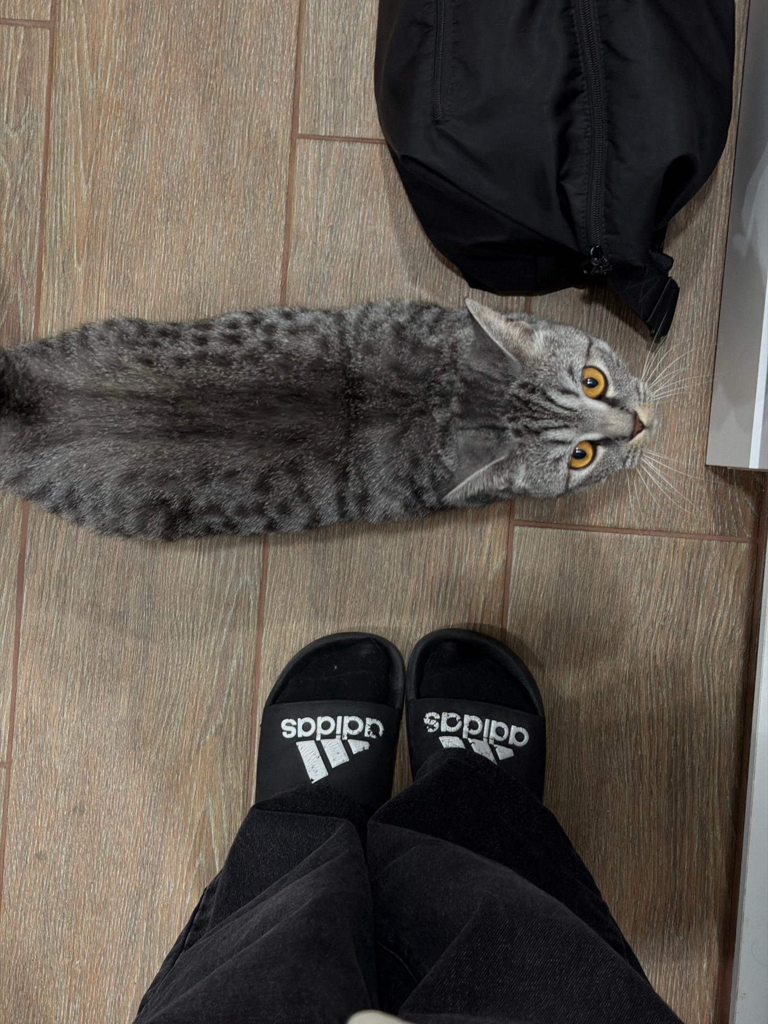 A gray tabby cat lies on a wooden floor, its head close to a black bag. A person in black pants and Adidas sandals stands nearby. The location is not identifiable as Yuzhny, Russia, based on the given…read more