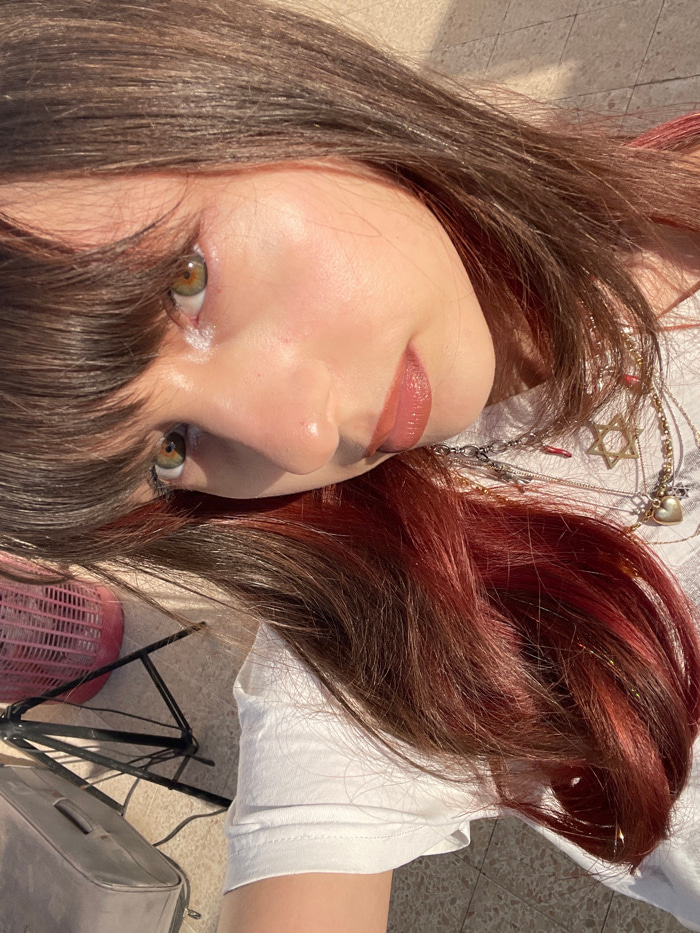 An overhead-angle shot depicts a female individual lying outdoors in Petah Tikva, Israel. The subject's upper body is visible, featuring fair skin, open green/hazel eyes, and glossed, reddish-brown li…read more