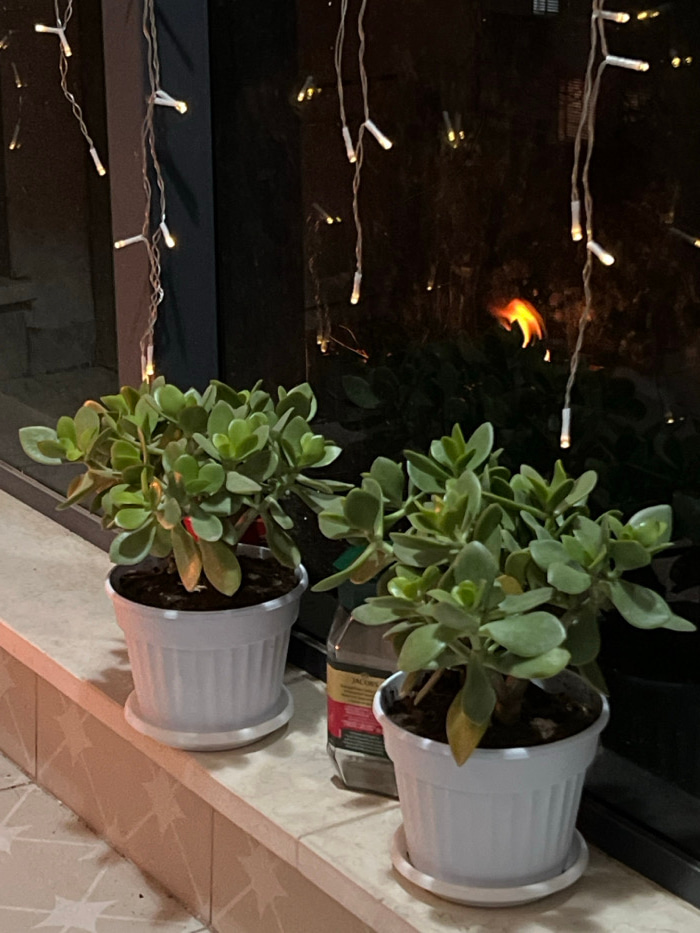 The scene depicts an exterior view at night from an interior vantage point in Kiryat Bialik, Israel, looking out through a window or glass door. In the foreground, two Crassula ovata (jade plants) in…read more