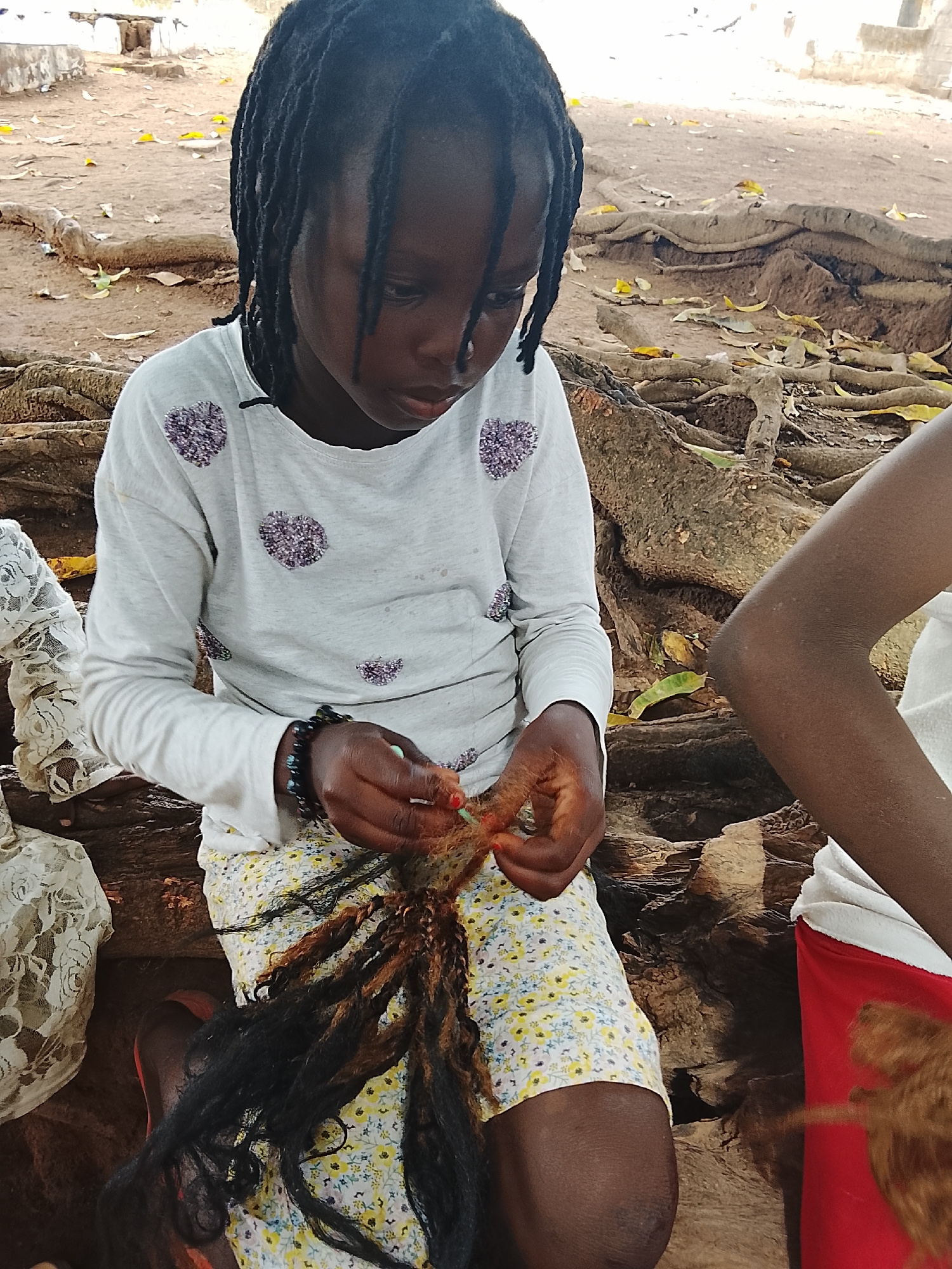 A young Black girl is sitting outside on what appears to be tree roots or a similar natural surface. She is wearing a long-sleeved light grey shirt with purple patterned circles, and a yellow floral s…read more