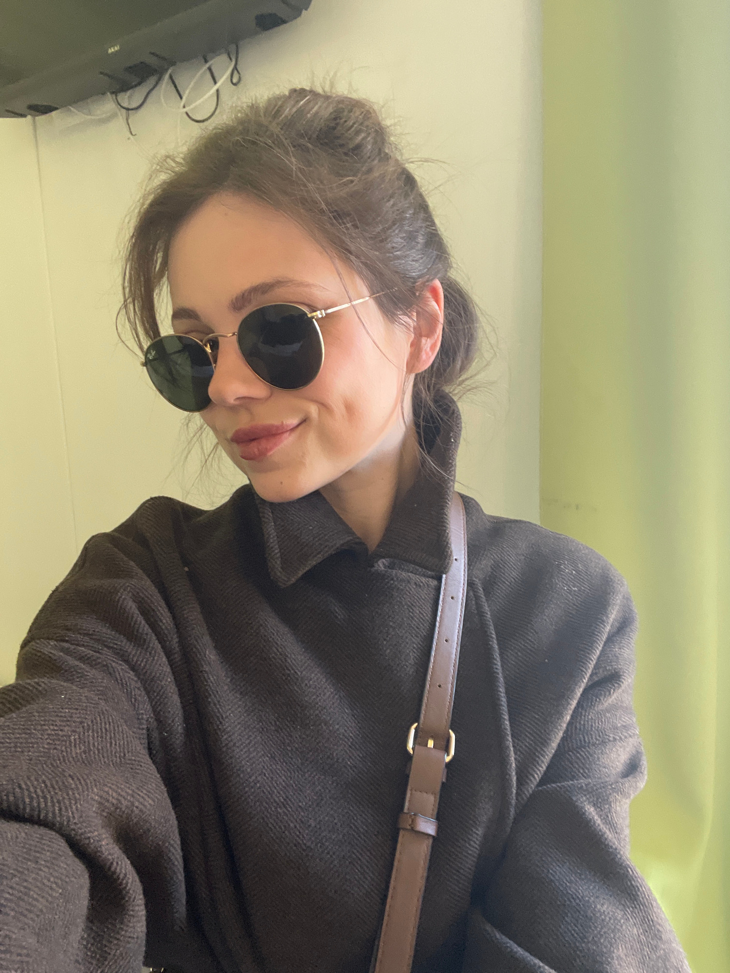 A woman is looking at the camera, wearing sunglasses and a dark coat with a brown strap across her chest. Her hair is pulled back. The background is plain and pale yellow, possibly a wall. The image h…read more