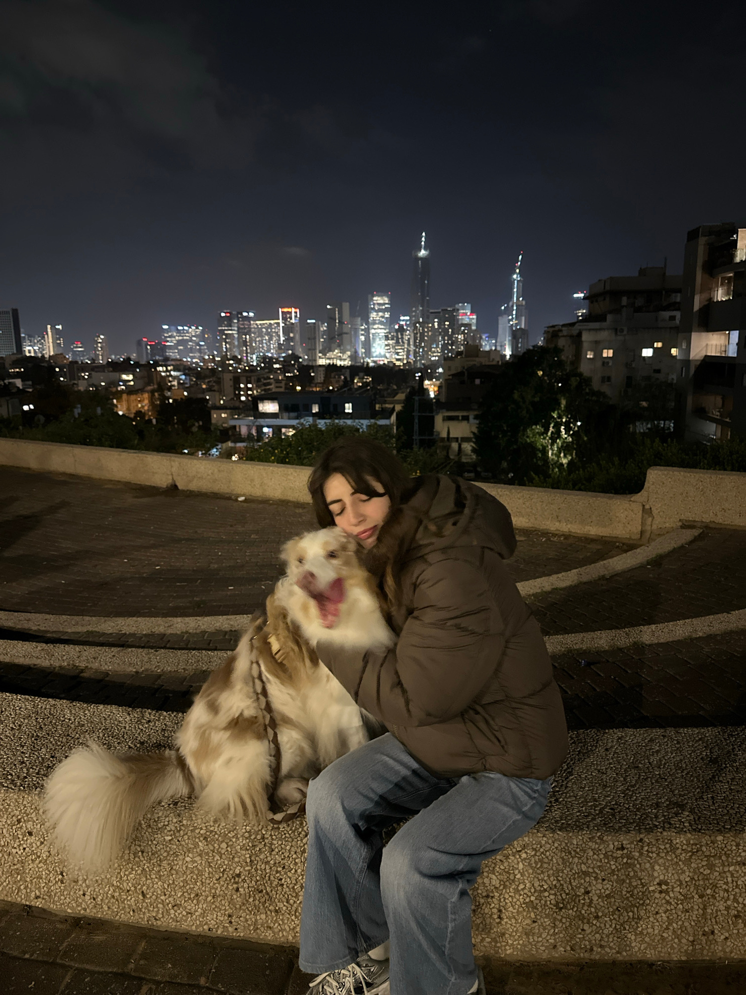 A night scene depicts a female subject and a canine subject on an elevated paved area in Givatayim, Israel. The female, with brown hair, wears a brown puffer jacket and blue jeans, seated on a low, liβ¦read more