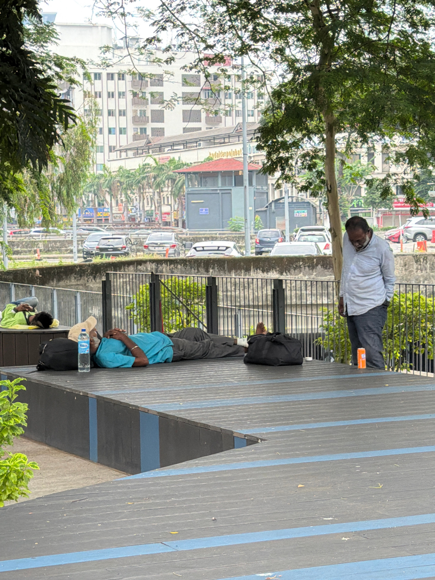 The image shows three individuals lying on a wooden platform with blue stripes. They appear to be sleeping or resting. The first individual is wearing a light-colored shirt and dark pants. The second…read more