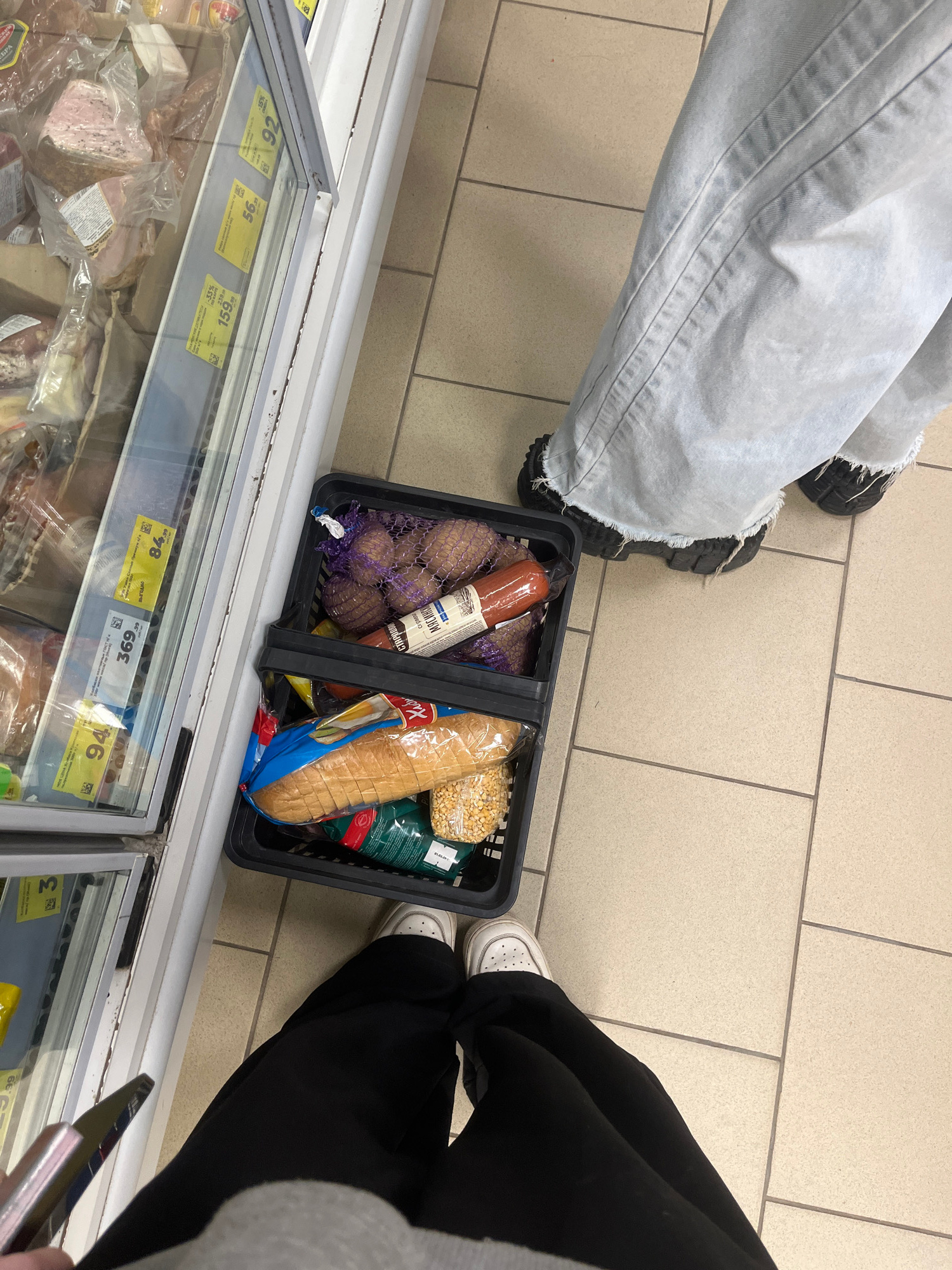 The image shows a top-down view of a shopping basket filled with groceries, standing in front of a refrigerated display case in what appears to be a grocery store. Two people are visible; one wearing…read more