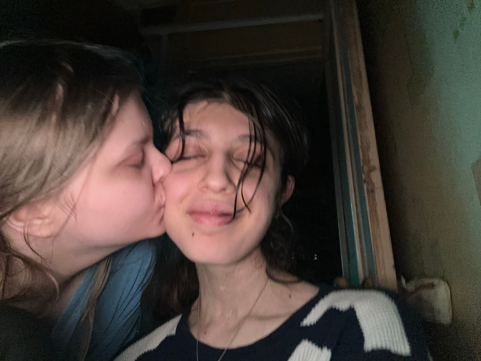 Two young women are positioned closely together. One woman is wearing a dark and white striped sweater. The other woman appears to be wearing a blue top. The scene has a dark and enclosed appearance. The setting resembles an interior space in a dilapidated or older building, as indicated by the worn walls and the door frame. It is not possible to determine the location in the city of Moscow, Russia from the provided image. | Open Wire