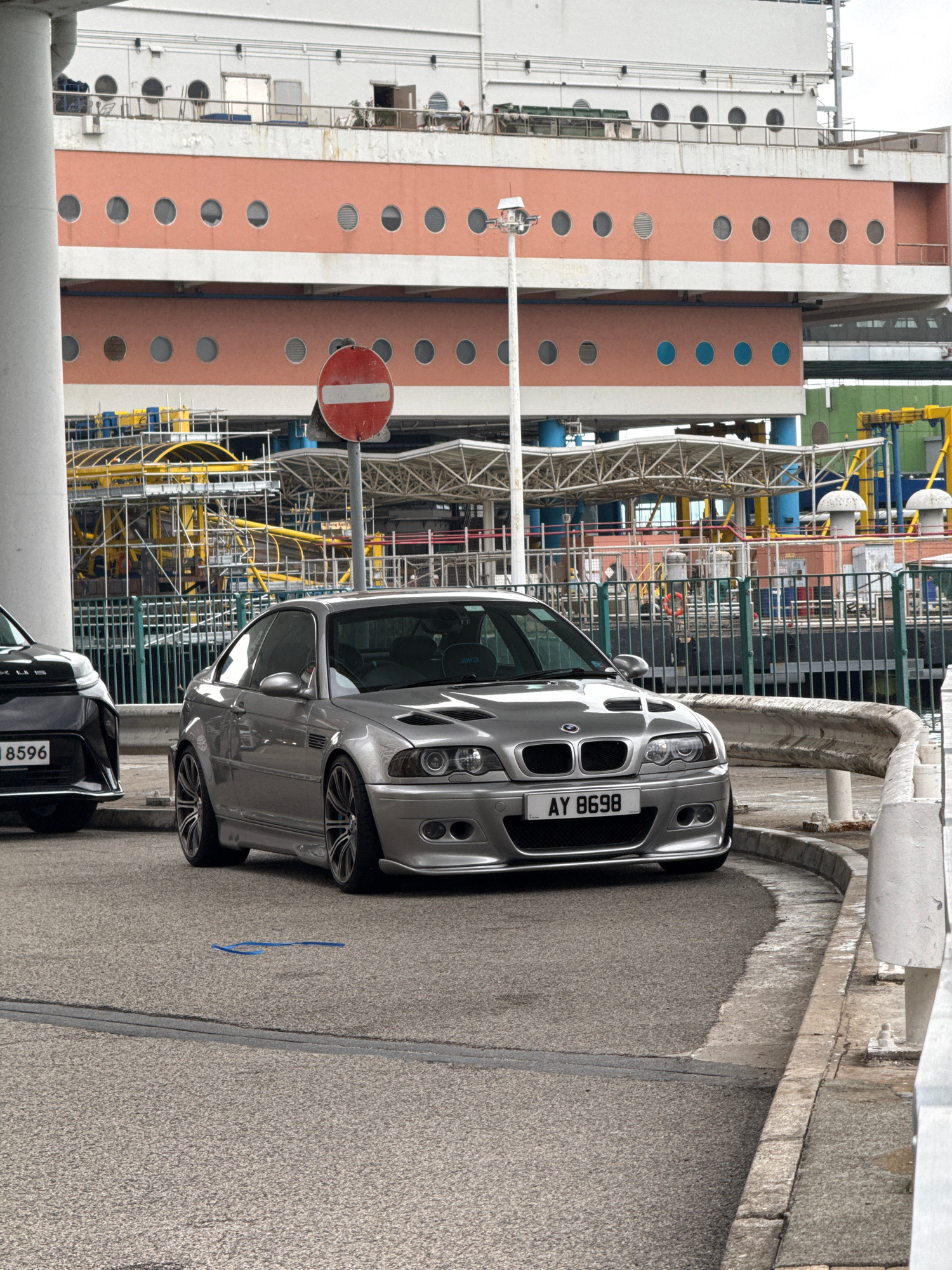 A silver BMW M3 with the license plate AY 8698 is parked on the side of a road. A black car is parked behind it with license plate **8596**. The background features a large building with multiple stor…read more