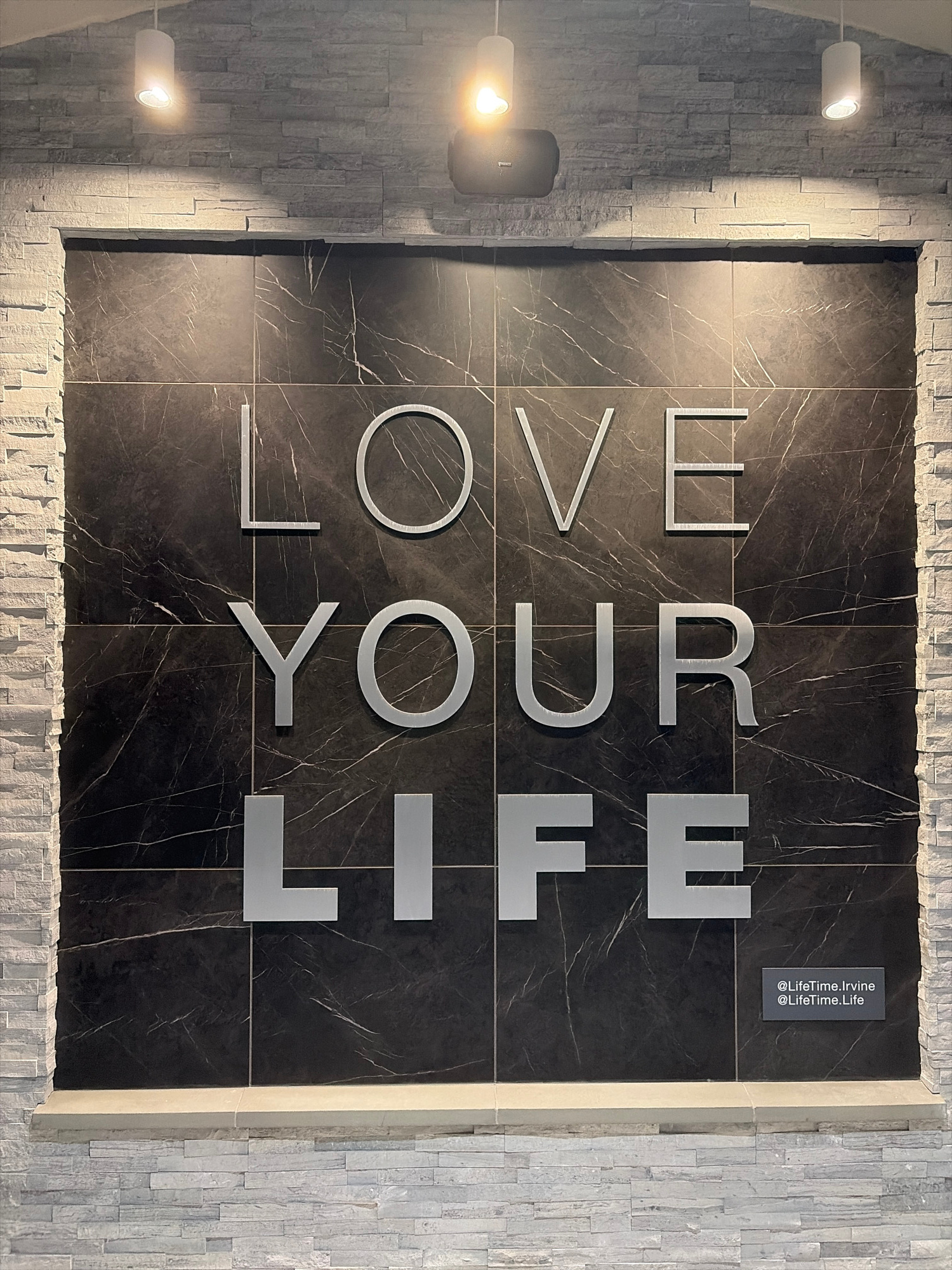 Here is a detailed description of the image: The image shows a decorative wall display with the words "LOVE YOUR LIFE" arranged vertically on a dark, marble-patterned tile surface. The letters are la…read more