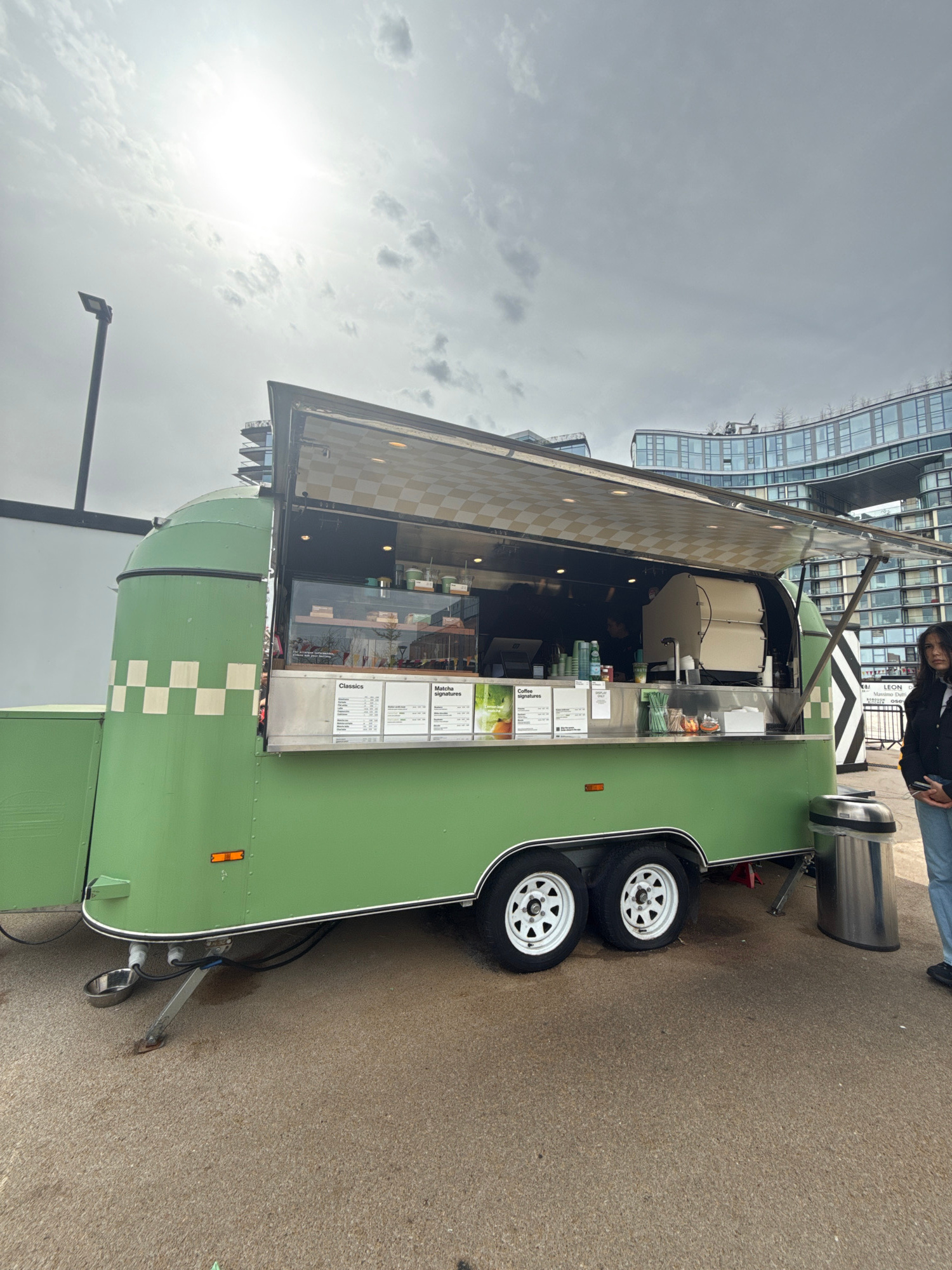 A food truck selling beverages is parked on a paved surface. The truck is primarily green with white checkered accents and has a hinged side that is open, revealing the interior preparation area and a…read more