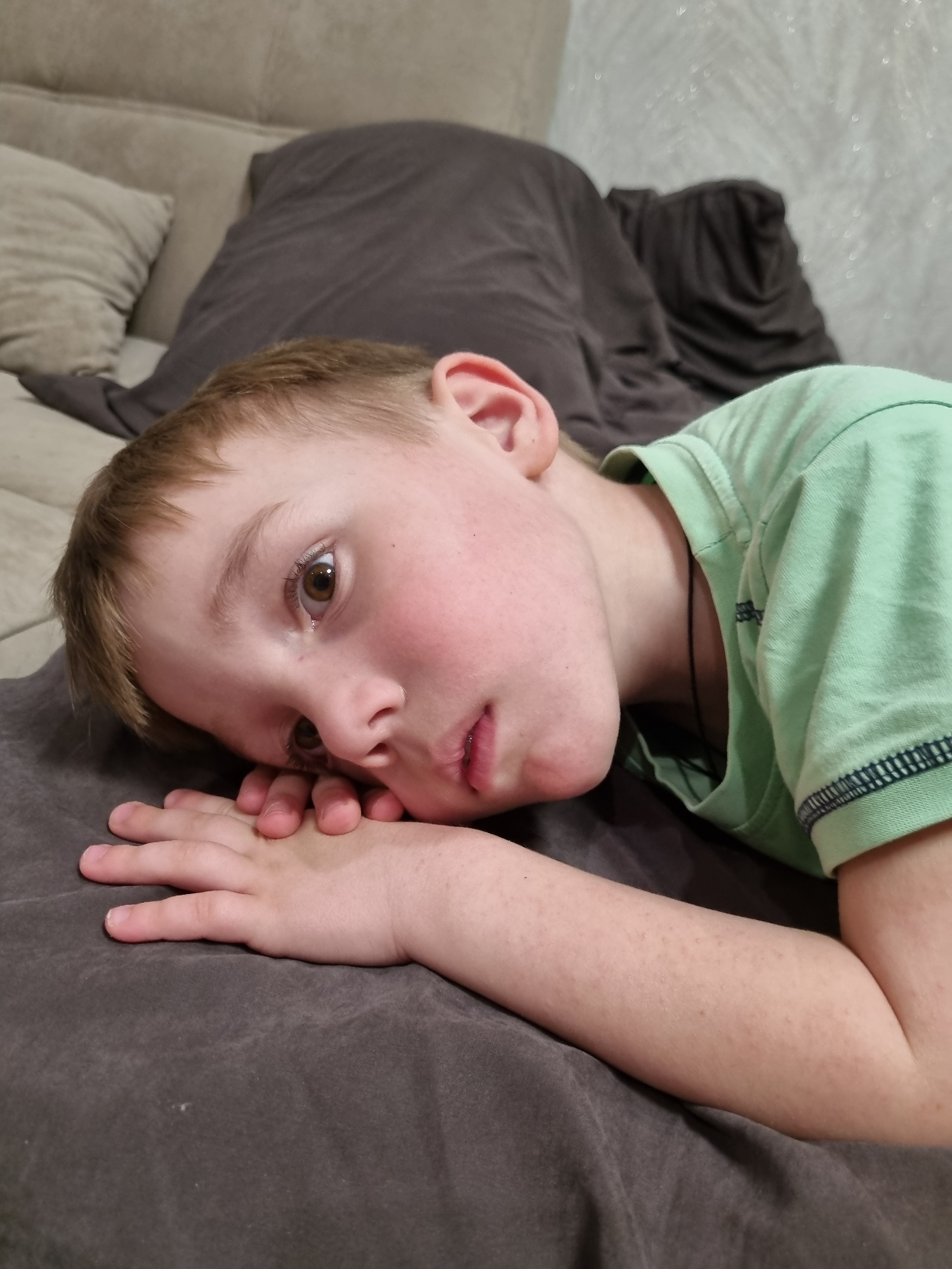 A young, fair-skinned boy is lying on his back on a dark gray fabric-covered surface, likely a couch or bed. He is wearing a light green t-shirt with dark trim around the collar and sleeves. His head…read more