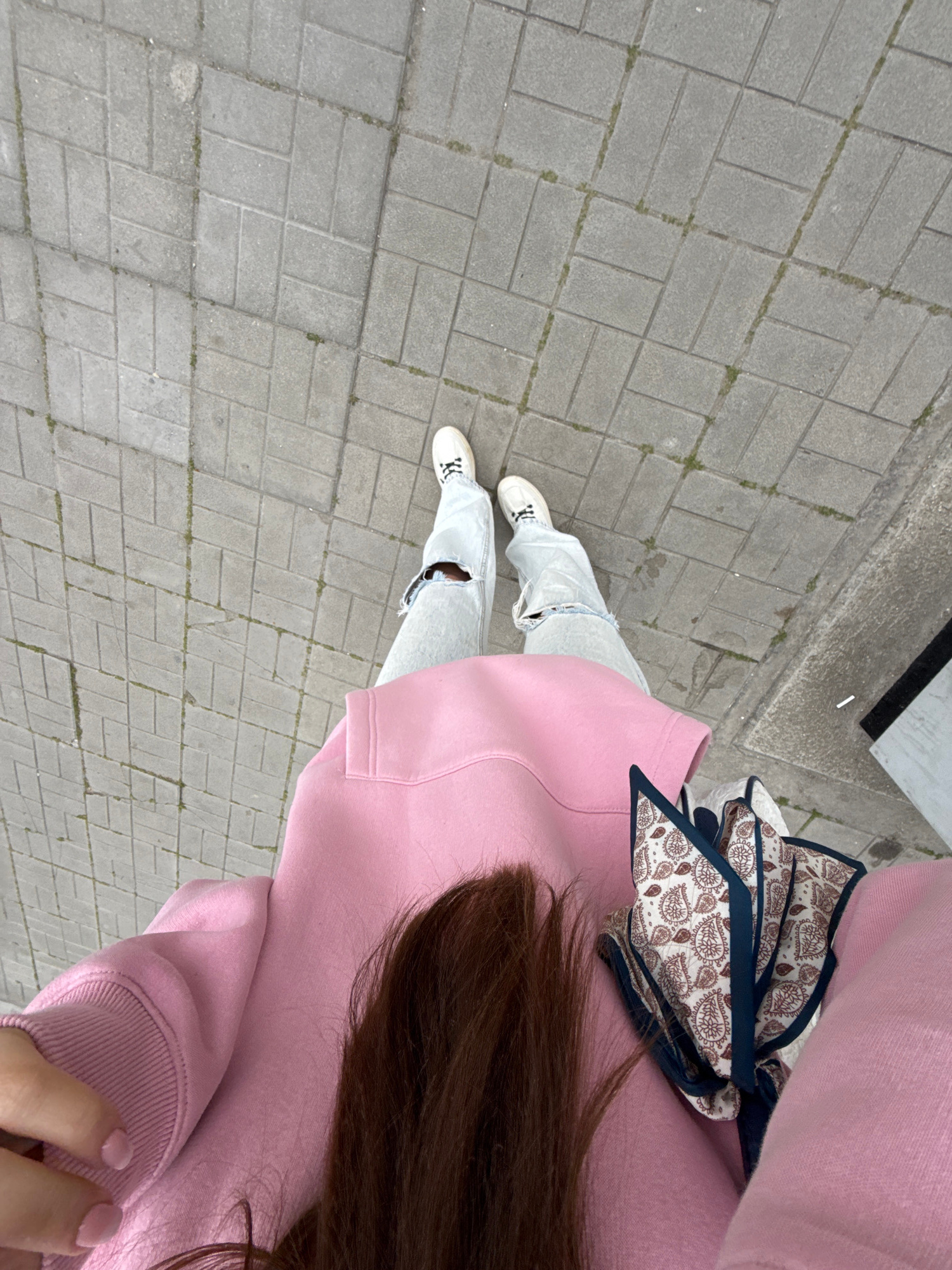 A first-person perspective shot looking down at a person standing on a paved walkway. The person is wearing a pink hooded sweatshirt, ripped light-wash jeans, and white sneakers. A paisley patterned s…read more