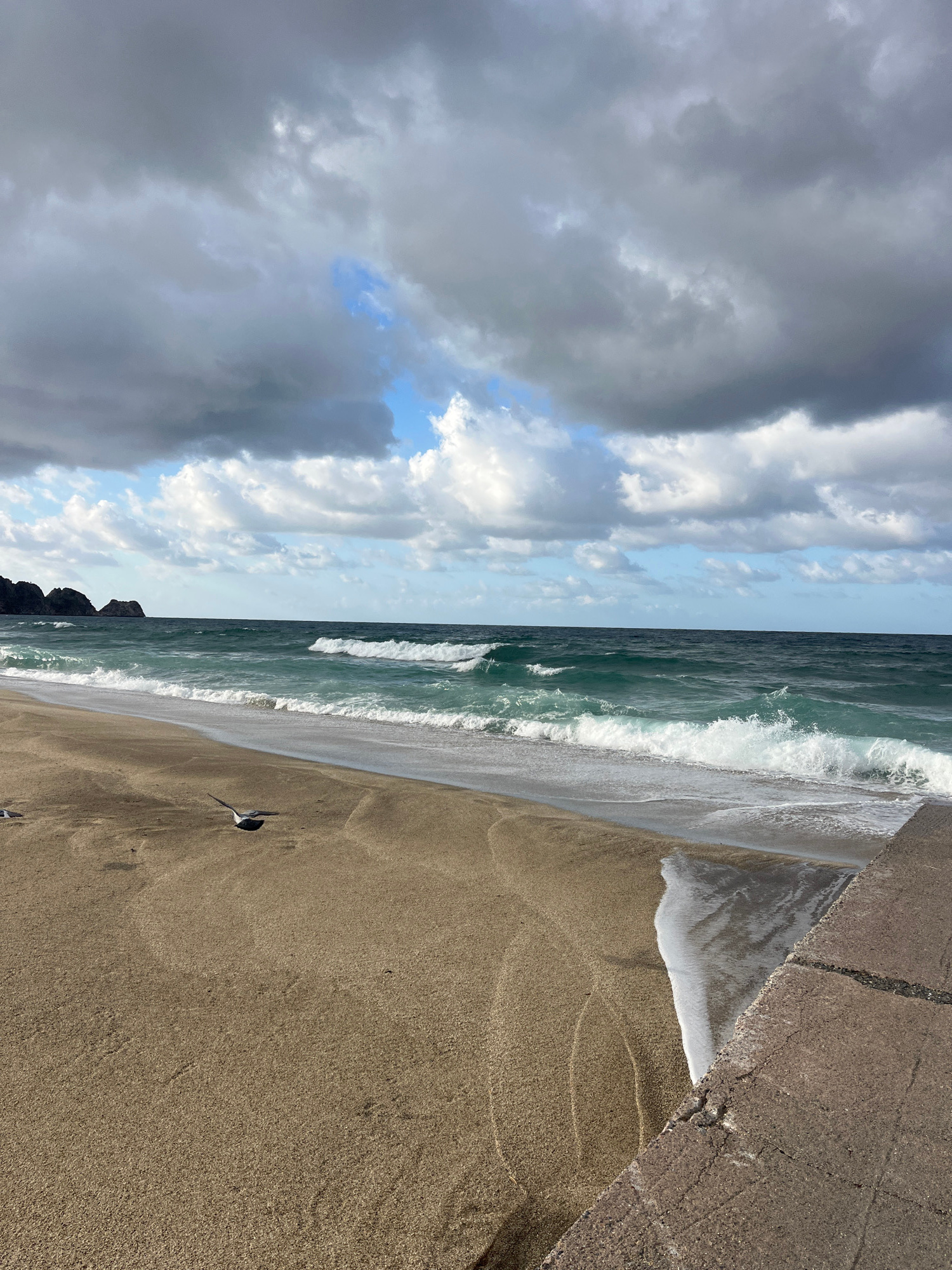 The image shows a beach scene in Alanya, Turkey. The sky on the left is filled with dark, heavy clouds, with patches of blue sky peeking through. The sea is rough with white-capped waves rolling towar…read more