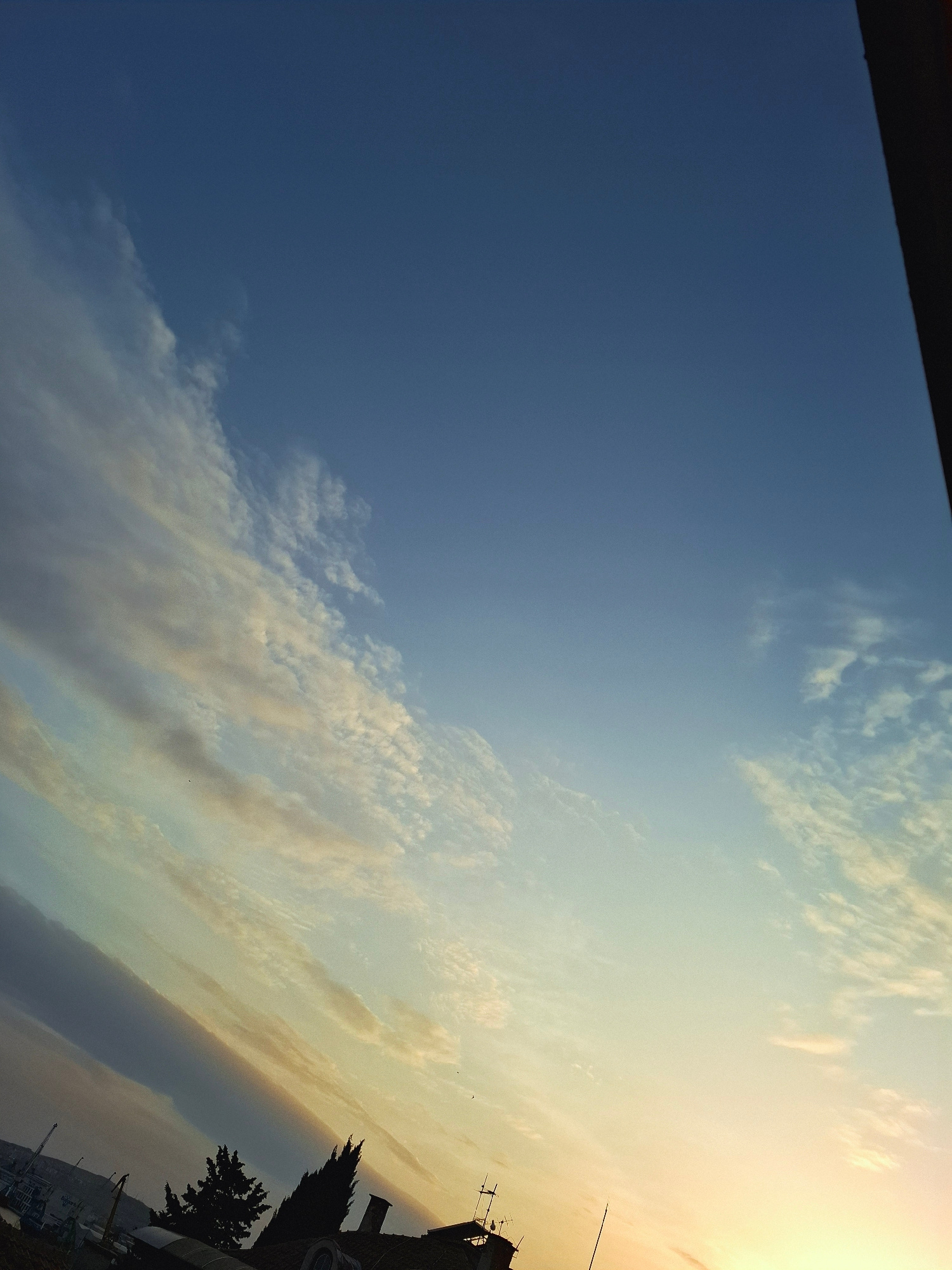 The image shows a view of the sky with a building, crane and tree in the bottom right corner of the frame. The sky features different shades of blue, from dark to light, and some clouds. There is a su…read more