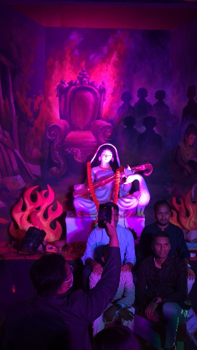 A statue of a deity sits adorned with a garland of orange flowers, next to a white swan on an ornate purple chair against a mural backdrop of pink and purple clouds. Flames sprout below. Men in casual…read more