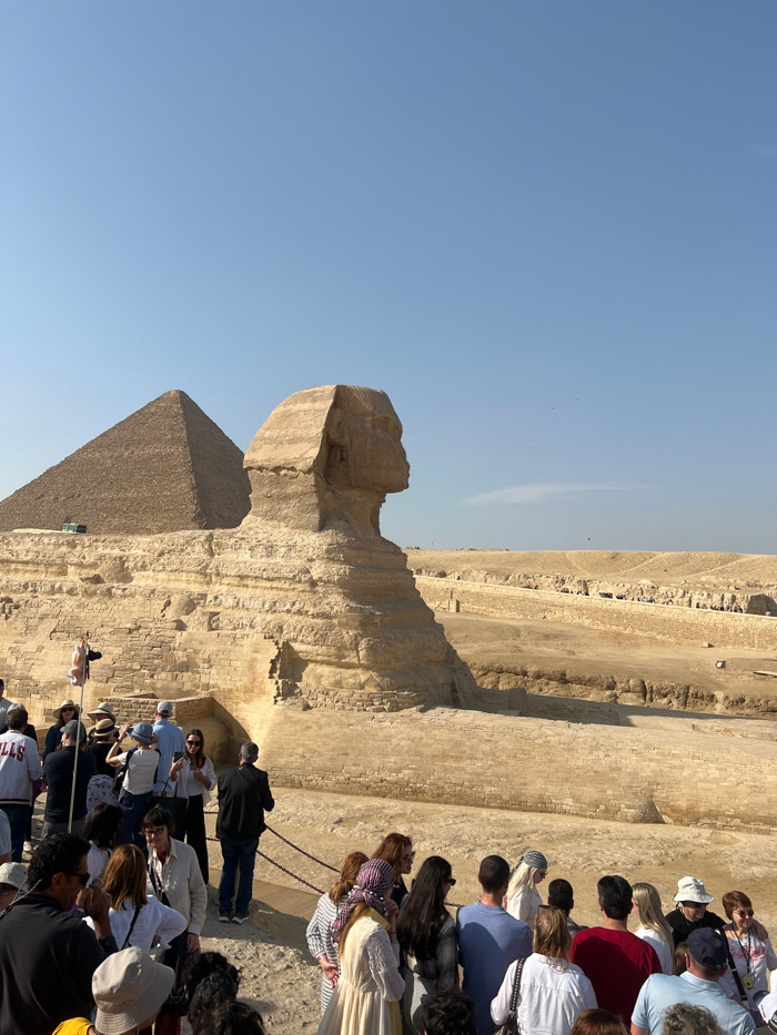 The image displays the Great Sphinx of Giza and a pyramid, identified as likely the Pyramid of Khafre, situated within the Giza Necropolis in Giza, Egypt. The scene is illuminated by bright daylight uā¦read more