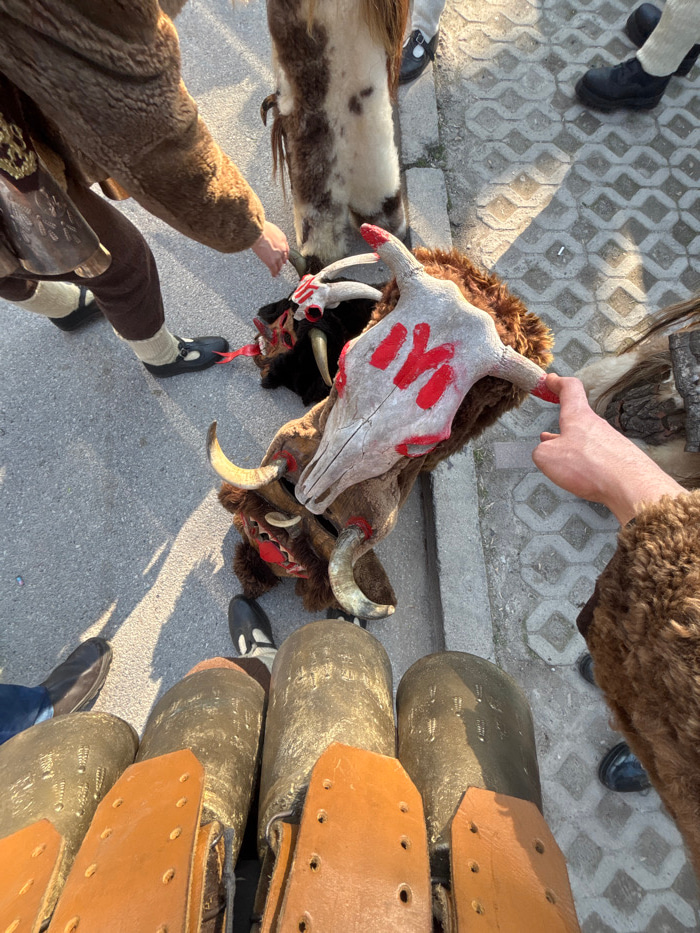 An outdoor, high-angle ground-level scene in Yambol, Bulgaria, depicts multiple individuals in traditional Bulgarian Kuker costumes. Centrally, a large, light-colored bovine skull with prominent hornsβ¦read more