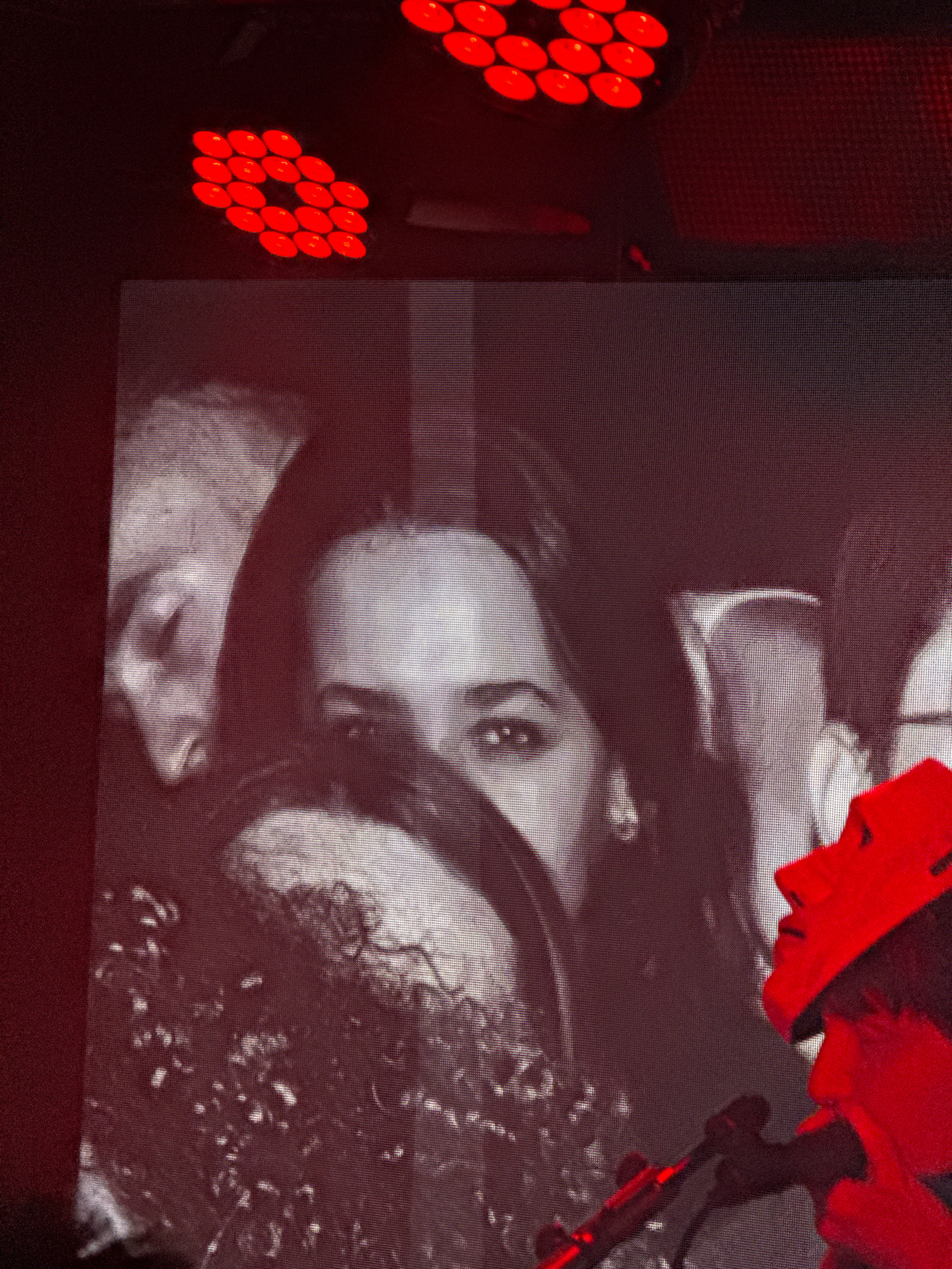 The image shows a screen displaying a black-and-white image of two people, with red stage lighting illuminating the left side of the frame. One person is looking directly at the viewer with dark eyes…read more