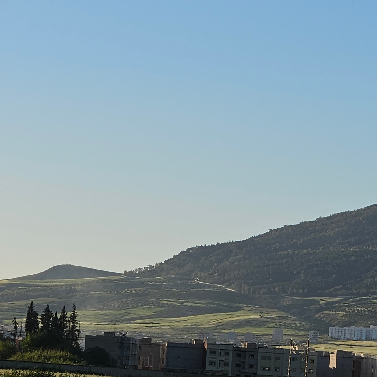 The image shows a landscape in Fez, Morocco. In the foreground, a clear blue sky dominates the left side of the frame. To the right, a steep, verdant mountain range is visible. At the base of the moun…read more