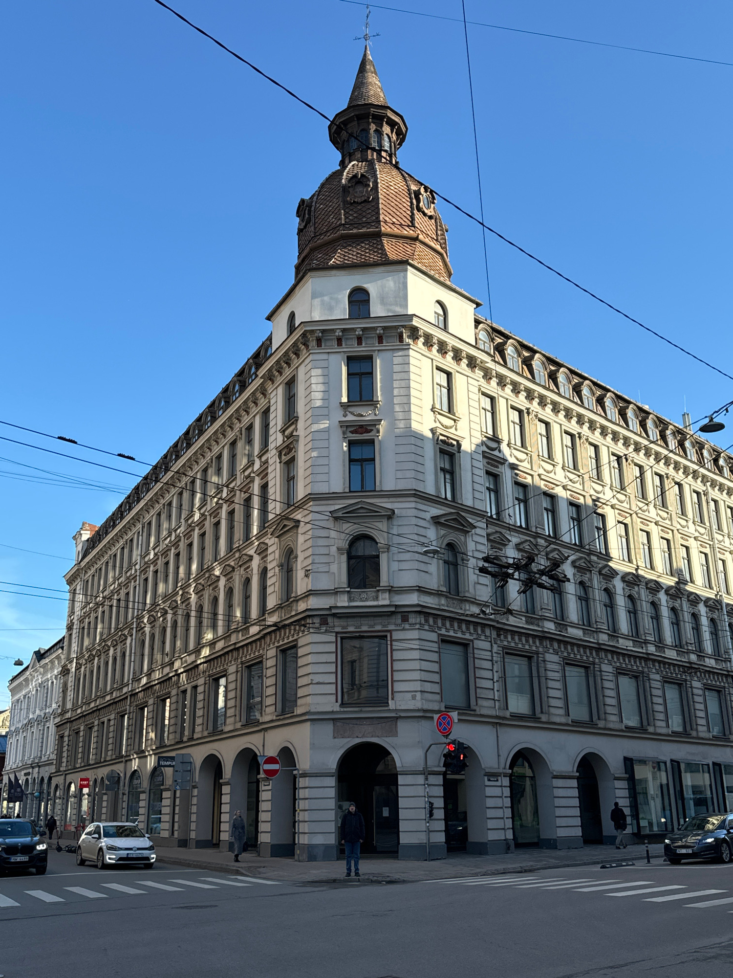 The image shows a tall building in Riga, Latvia, under a clear blue sky. The building is light-colored with many windows and ornate architectural details. It has a tower-like structure on one end with…read more