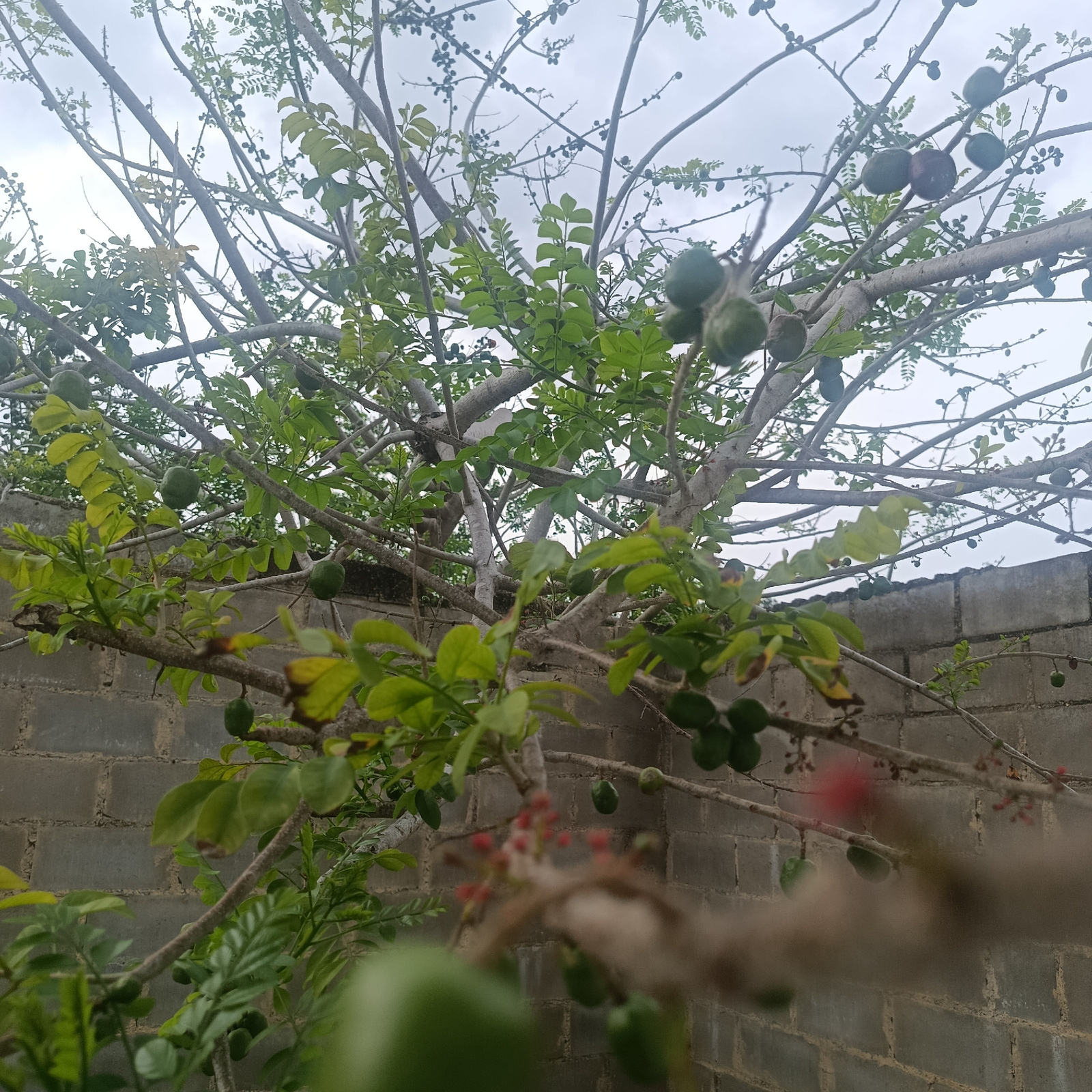 The image depicts a tree laden with green fruits in what appears to be a residential backyard setting. The tree's branches are intertwined and spread across the frame, with green leaves interspersed a…read more