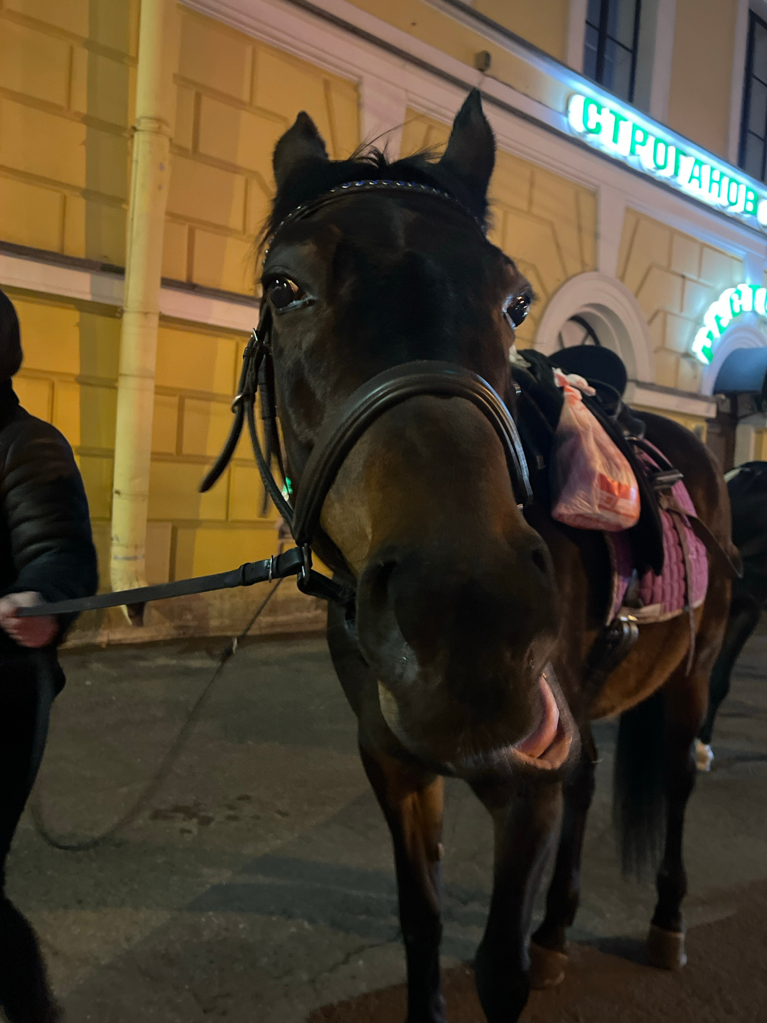 The image shows a close-up of a dark-colored horse with a bridle and saddle in Saint Petersburg, Russia. The horse is standing on a street, with the side of a building visible in the background. The b…read more