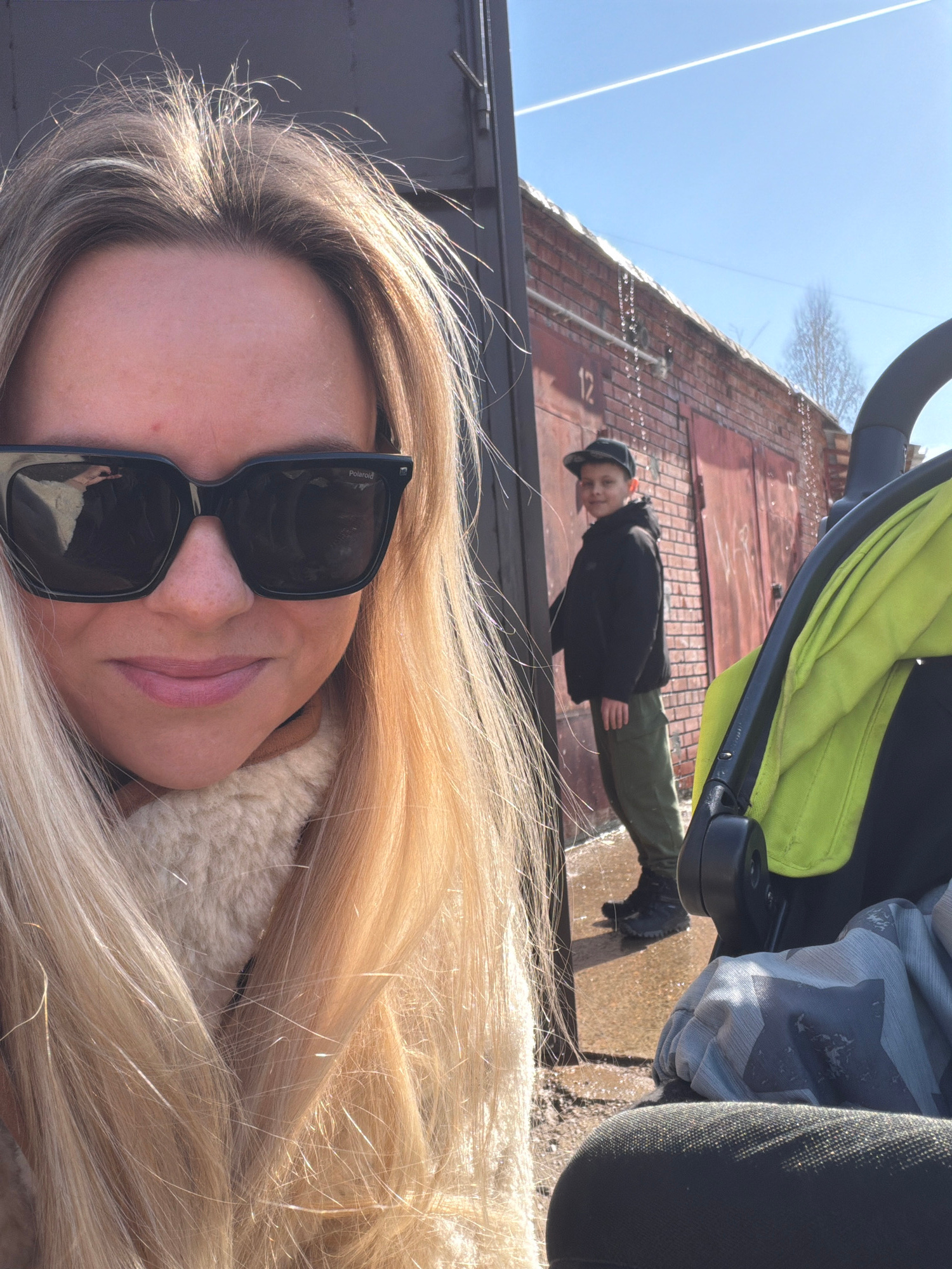 The photograph depicts a woman taking a selfie, with her face partially obscured by large sunglasses. She has long, blonde hair and is wearing a fluffy, light-colored coat or jacket. Behind her, refleβ¦read more