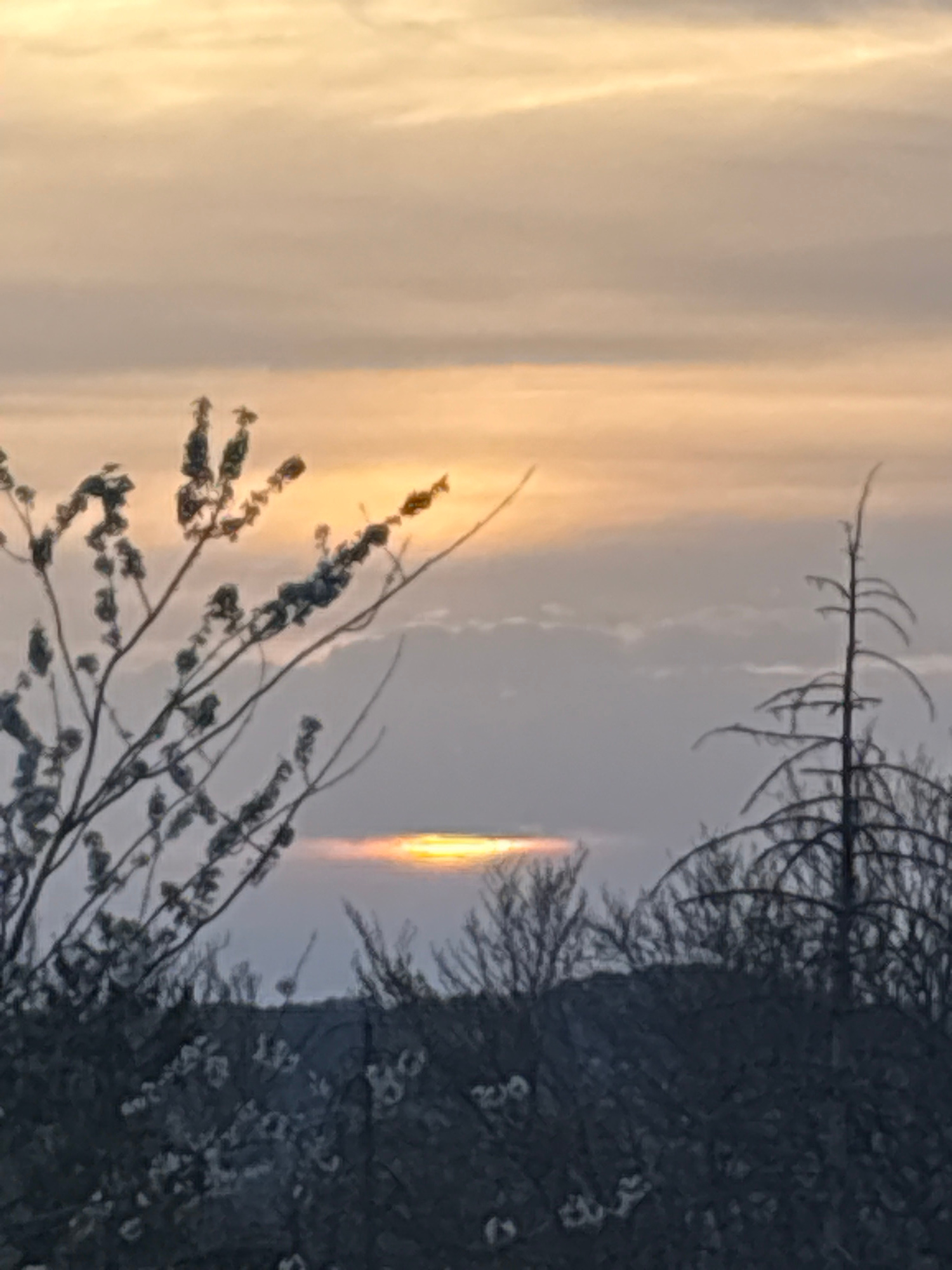 The image shows a vertical light pillar, likely a sun pillar, visible in the sky. The foreground includes silhouetted trees and branches. The sky is pale with some cloud formations. The location is Sc…read more