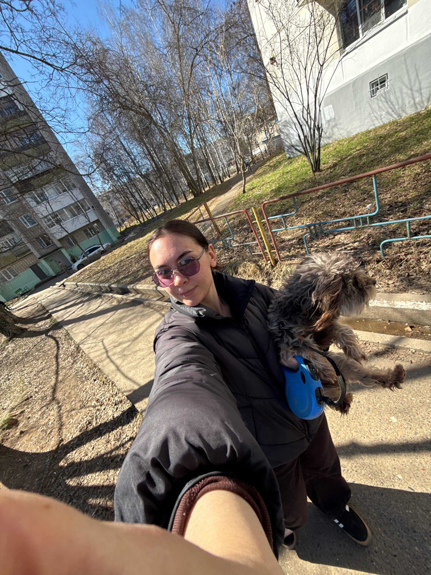 A person is holding a dog on a leash, on a sidewalk in an urban setting. The person is wearing sunglasses and a dark jacket, while the dog appears to be a medium-sized, fluffy breed. The location is i…read more