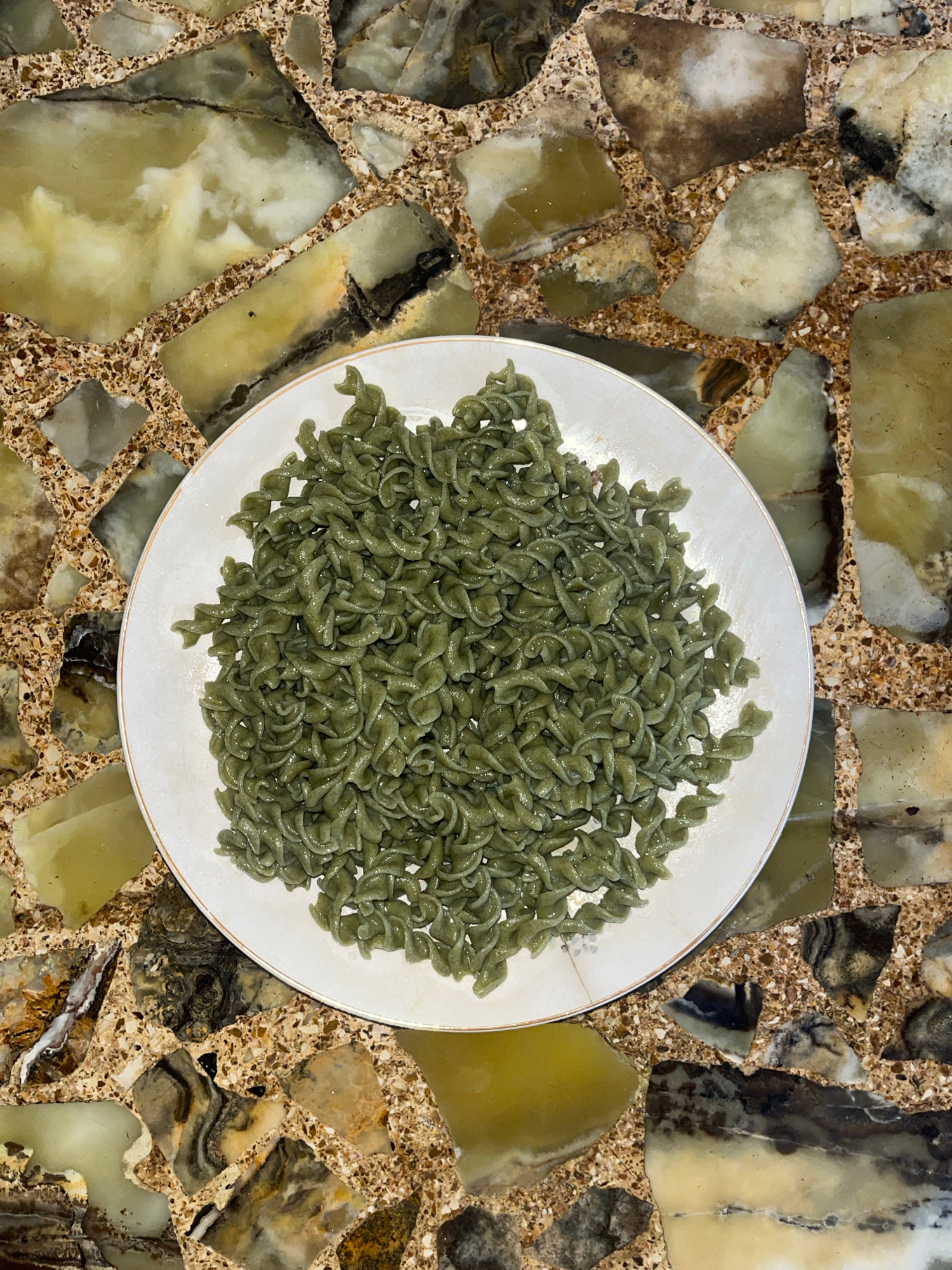 A top-down shot shows a white plate piled high with green pasta on a mottled, brown-and-tan stone surface. The pasta appears to be of the fusilli variety, though with a slightly different, less pronou…read more