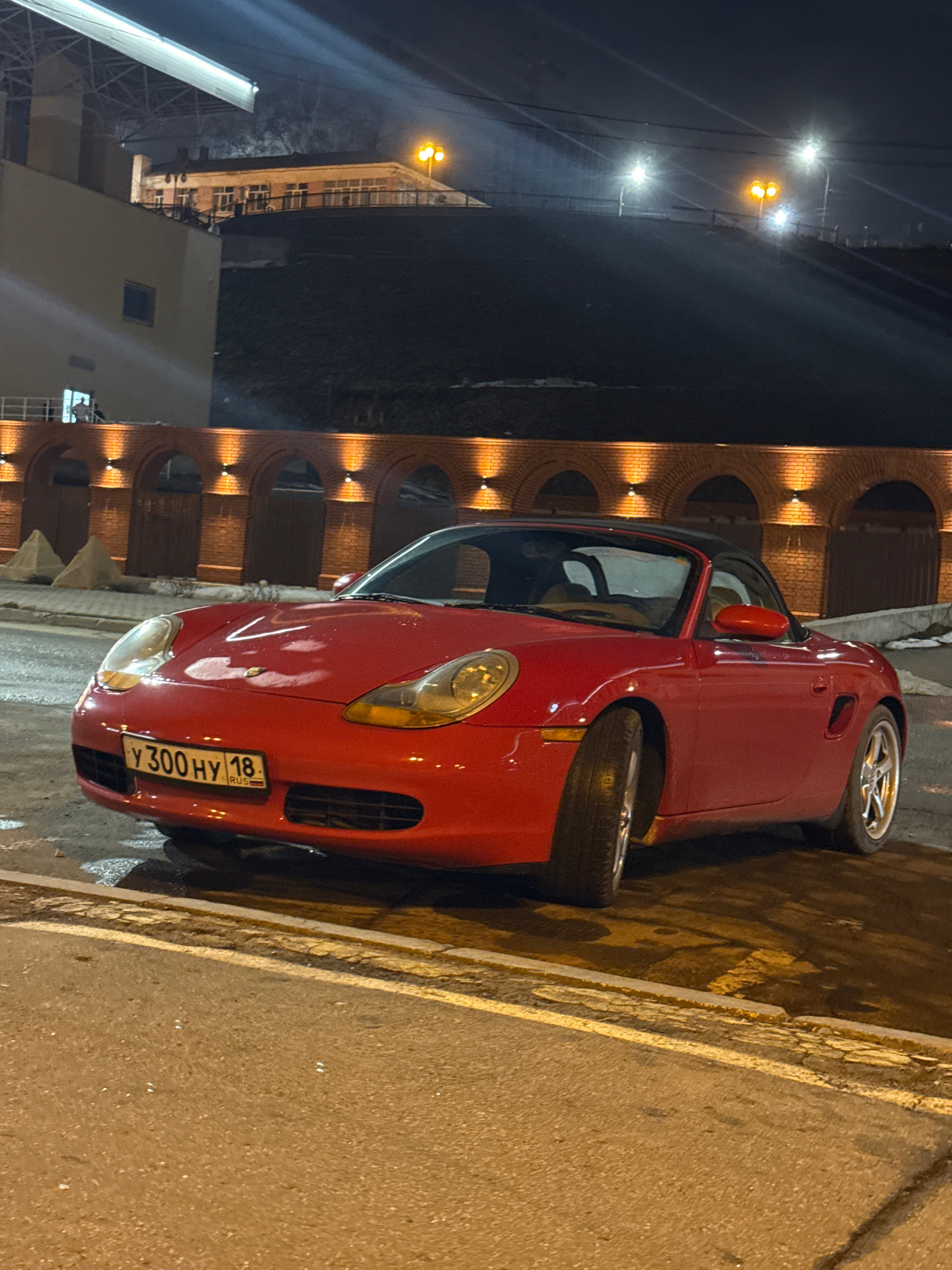 A red convertible car, likely a Porsche, is parked on a street adjacent to a building with arched windows and decorative lighting. The license plate on the car reads "У 300 НУ 18 RUS", indicating the…read more
