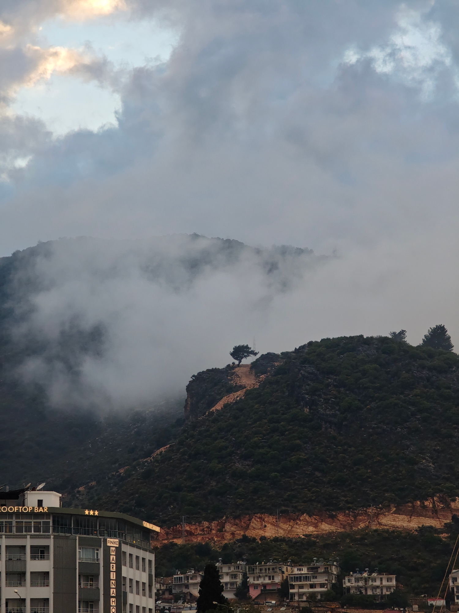 The image shows a view in Finike, Turkey. The lower portion of the frame is dominated by a tall building, identified as the "Finike Marina Hotel" by signage on its side. The building also features a "…read more