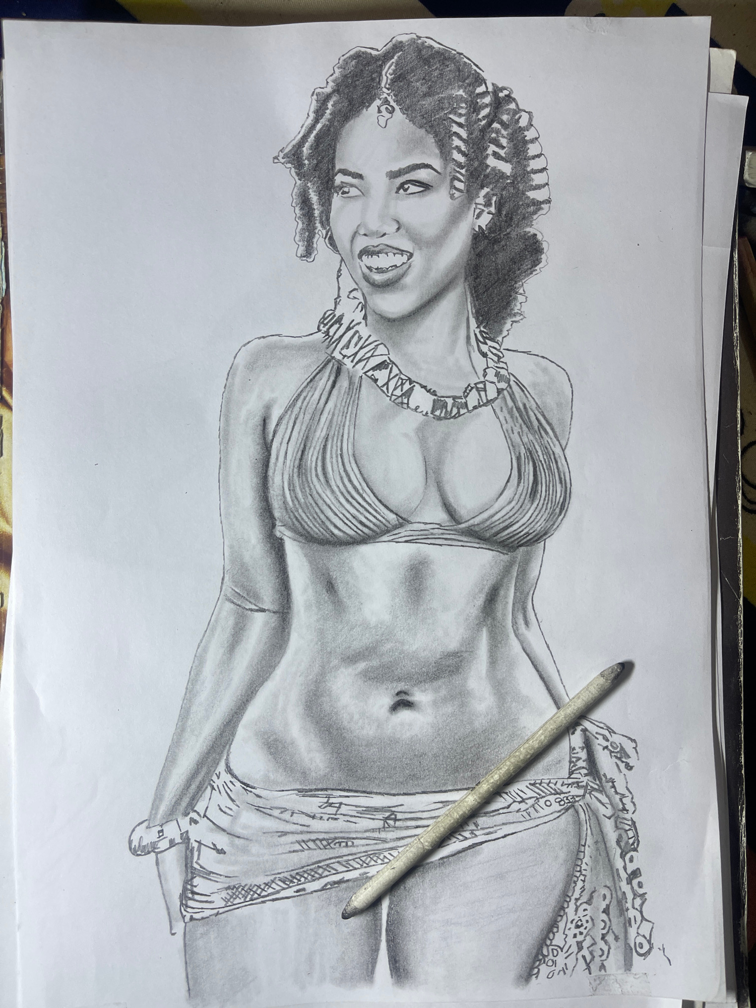 A pencil drawing of a woman is on a sheet of white paper. The woman has dark, curly hair and is wearing a top that reveals cleavage. A cloth with patterns is draped around her waist. A drawing pencil…read more