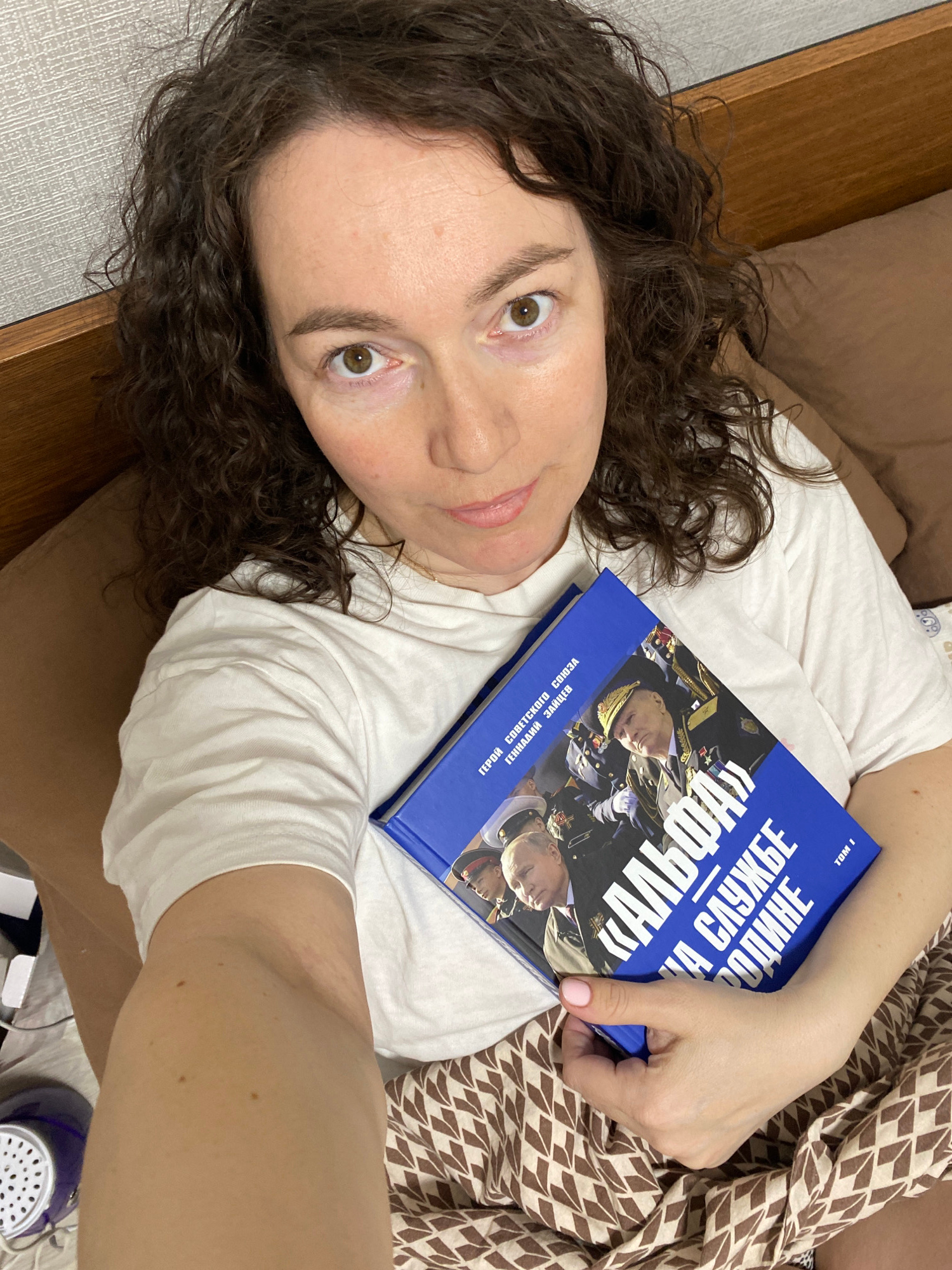 A woman with curly dark hair is lying down, looking at the camera, and holding a blue book titled "Alpha: In the Service of the Motherland" by Gennady Zaitsev, Hero of the Soviet Union. She's wearing…read more