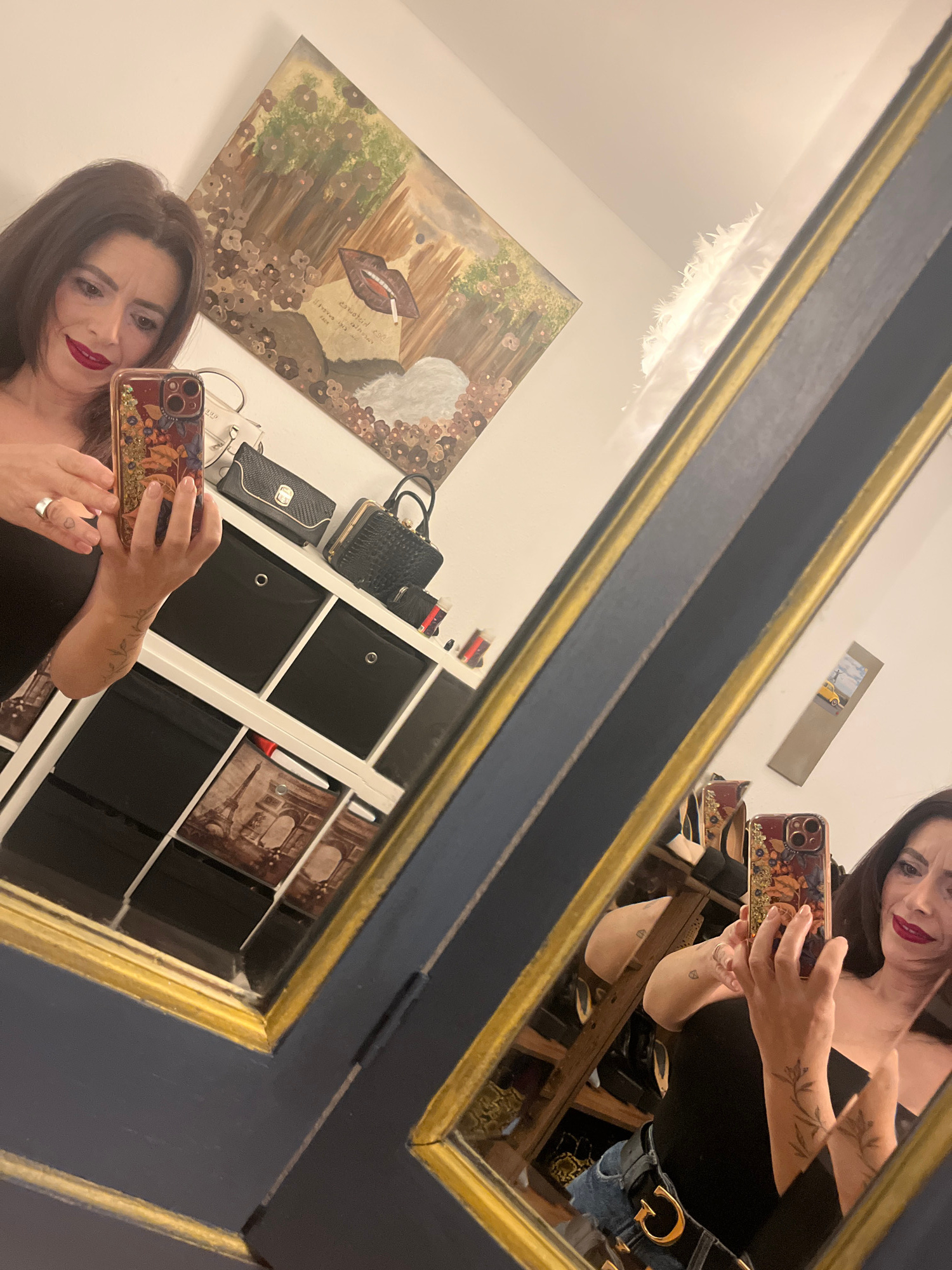 A woman takes a selfie in front of a mirror. The mirror reflects a room with a painting and shelving units. The woman is wearing a black top and red lipstick. The city of Konz, Germany, is not discern…read more