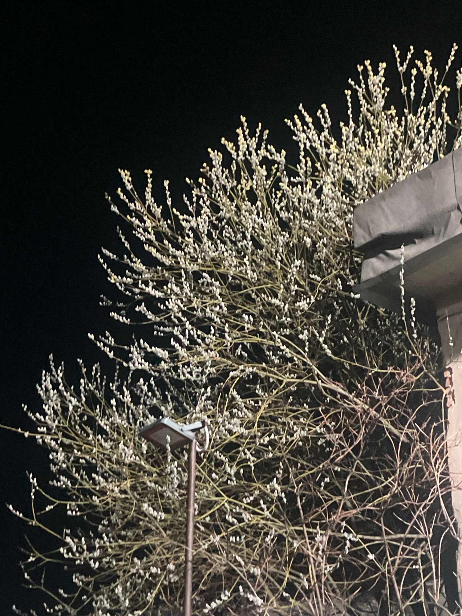 The image depicts a bush with thin, bare branches covered in small, light-colored buds, possibly pussy willow, against a black background. A gray object is partially visible in the upper left corner o…read more